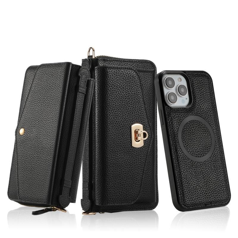 Θήκη τηλεφώνου για iPhone 13 Pro MagSafe Crossbody, πολυλειτουργική με φερμουάρ και δέρμα Lychee (Λευκό)