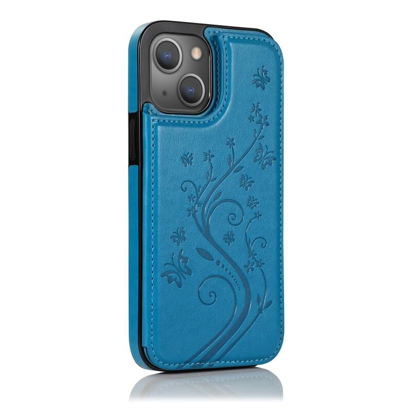 For iPhone 13 Pro Max Butterflies Flowers Double Buckle PU + TPU Protective Case with Holder & Card Slots & Photo Frame (Blue)