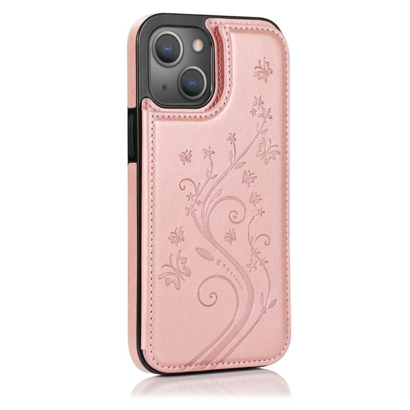 For iPhone 13 Pro Max Butterflies Flowers Double Buckle PU + TPU Protective Case with Holder & Card Slots & Photo Frame (Rose Gold)