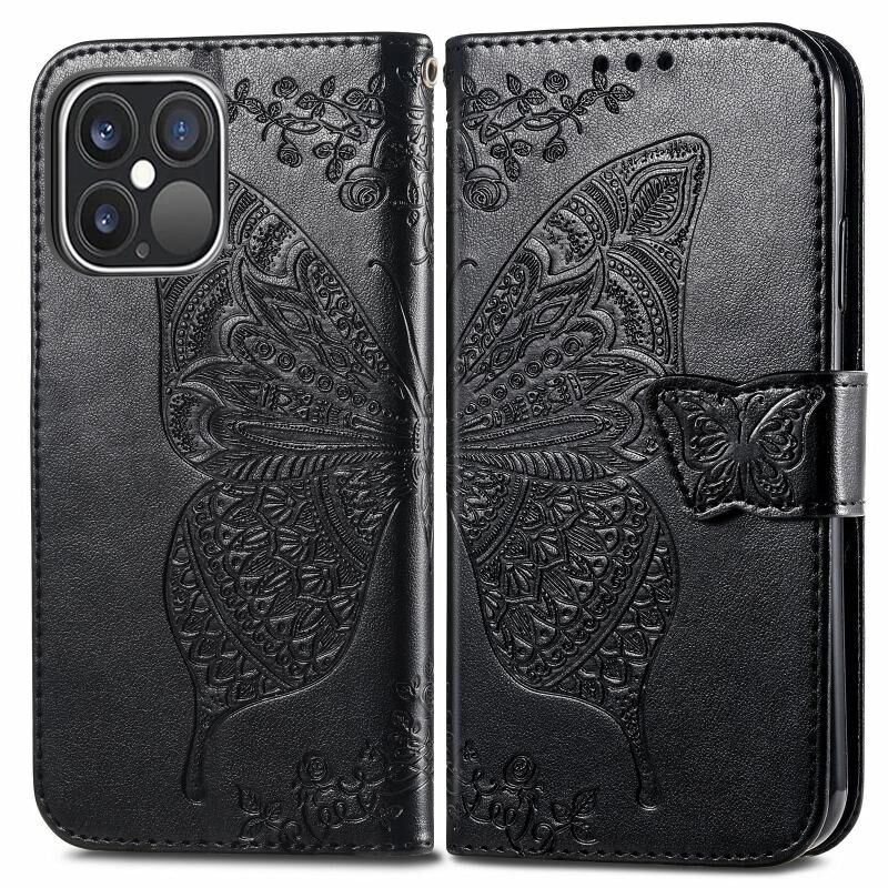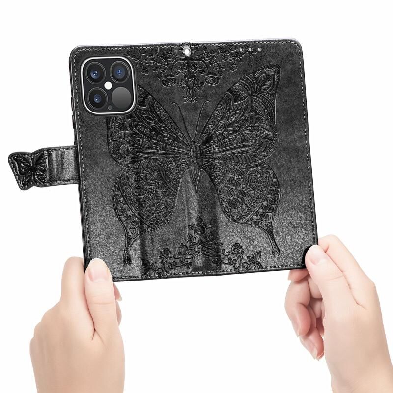 Θήκη για iPhone 13 Pro Max, Δερμάτινη οριζόντια θήκη με σχέδιο πεταλούδας και λουλουδιών, ανάγλυφη, με βάση στήριξης / υποδοχή κάρτας / πορτοφόλι / κορδόνι (Μαύρο)