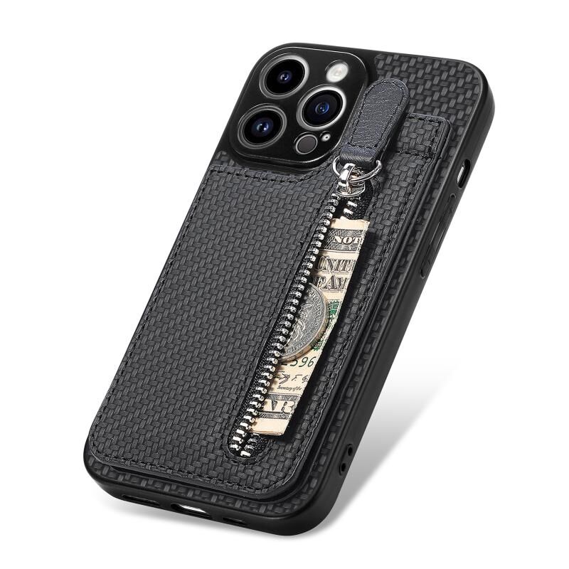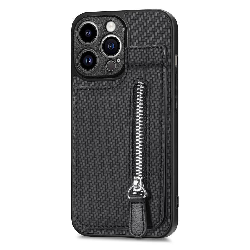 For iPhone 13 Pro Max Carbon Fiber Vertical Flip Zipper Phone Case(Black)