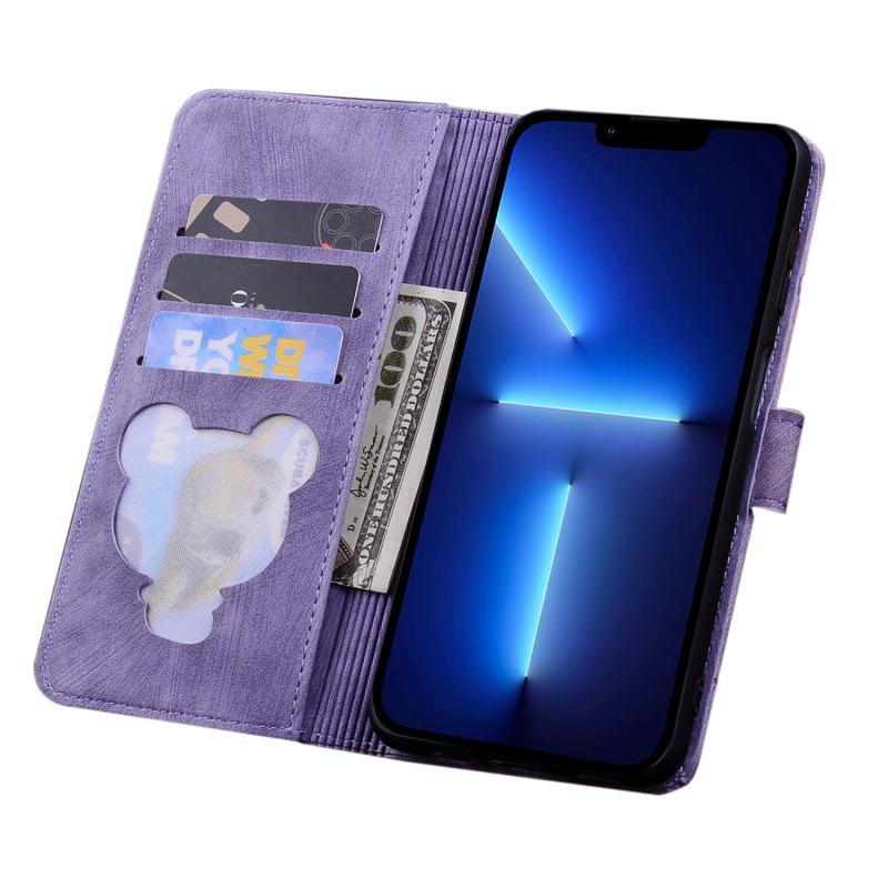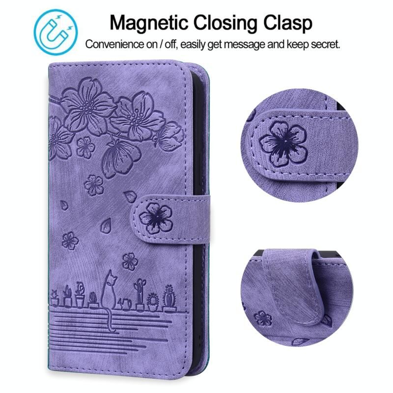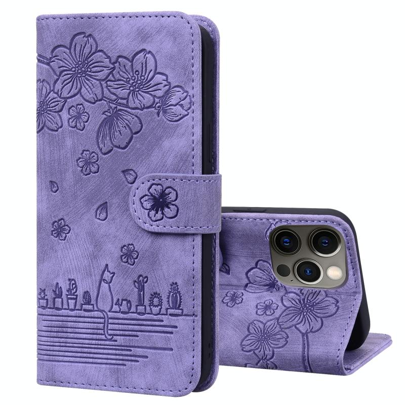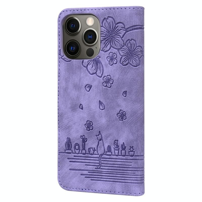 Θήκη Δερμάτινη με Χαριτωμένη Γάτα και Άνθη για iPhone 13 Pro Max (Μωβ)