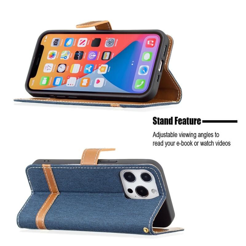 Θήκη για iPhone 13 Pro Max με υφή τζιν, οριζόντια, αναδιπλούμενη από δέρμα, με βάση στήριξης, θήκες για κάρτες, πορτοφόλι και λουρί (Μωβ)