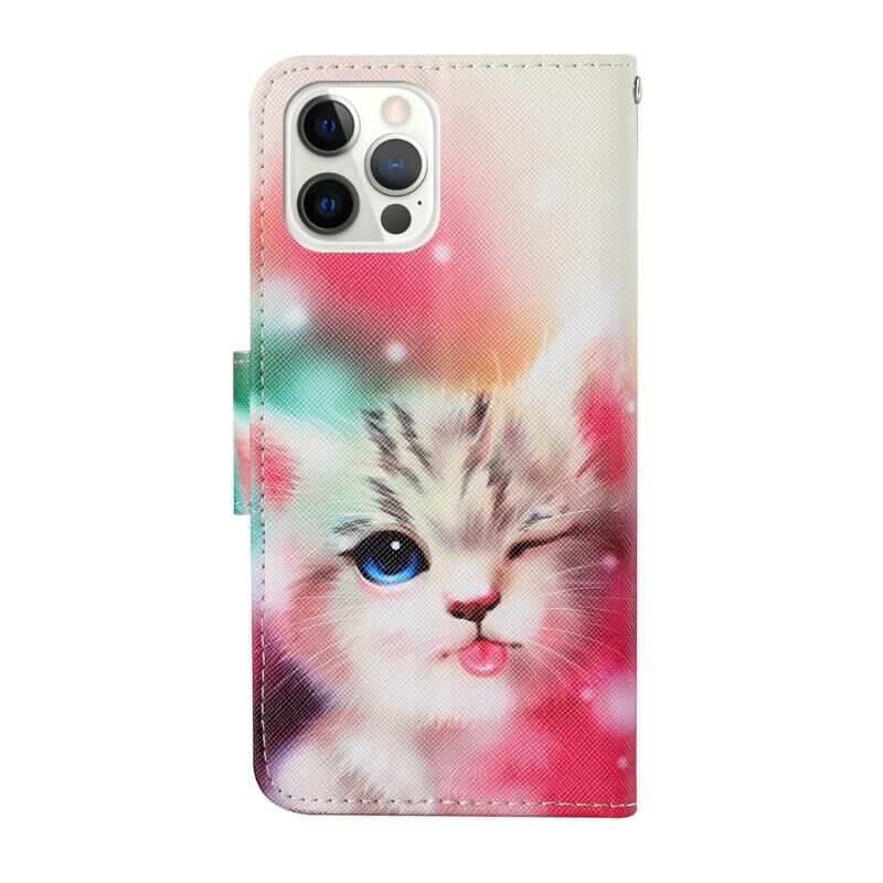 Θήκη τηλεφώνου δερμάτινη οριζόντιας αναδίπλωσης με σχέδιο πολύχρωμης ζωγραφικής για iPhone 13 Pro Max (Γάτα που Σκύβει)