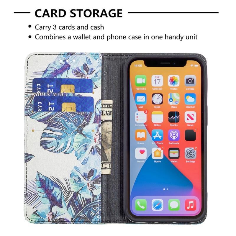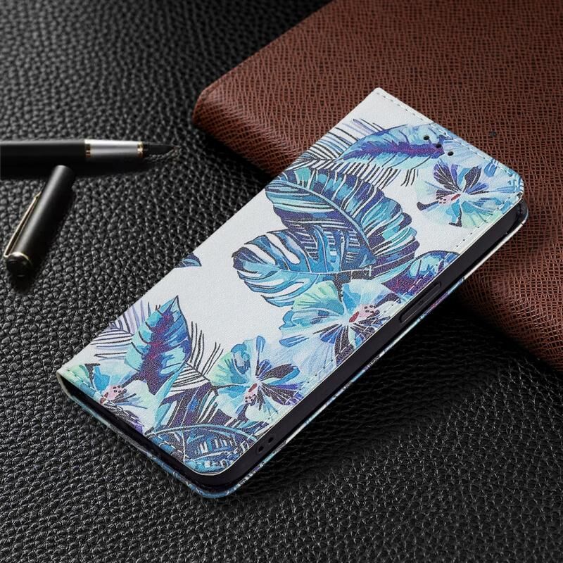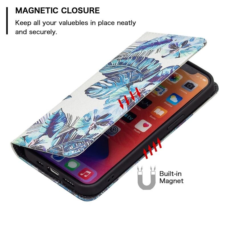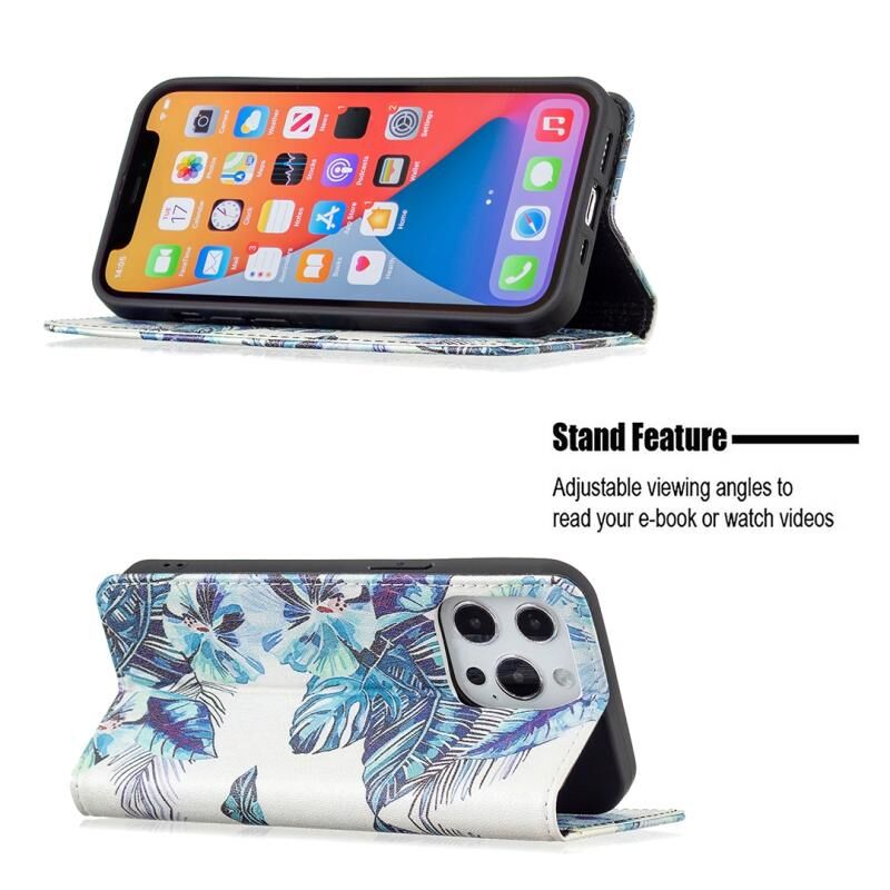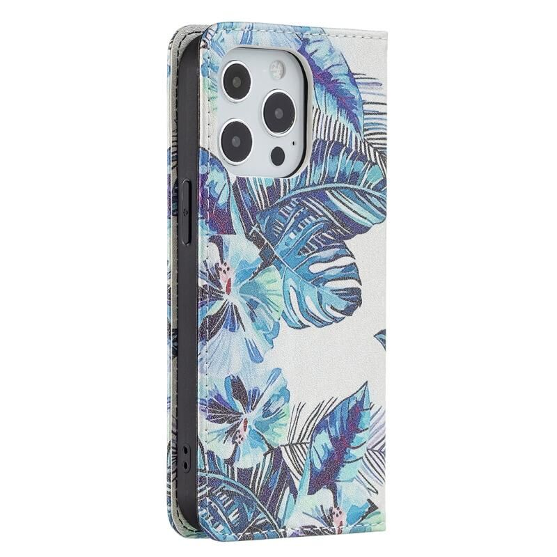 For iPhone 13 Pro Max Colored Drawing Pattern Invisible Magnetic Horizontal Flip PU Leather Case with Holder & Card Slots & Wallet (Blue Leaves)