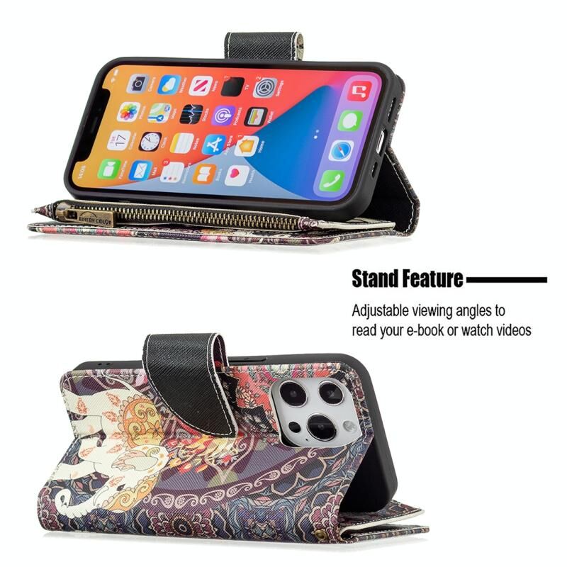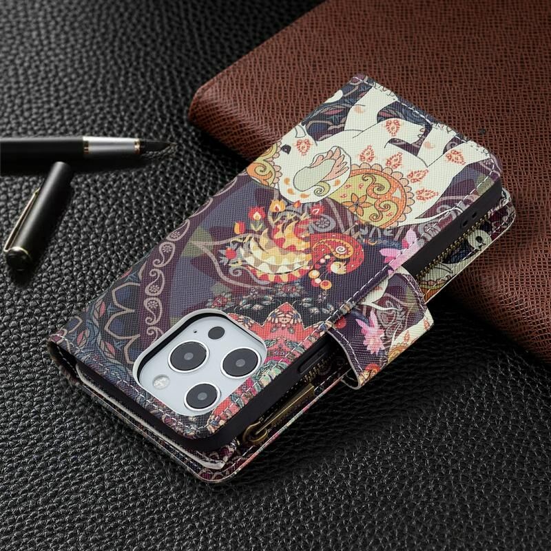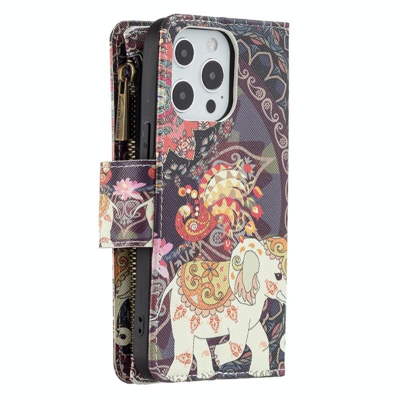For iPhone 13 Pro Max Colored Drawing Pattern Zipper Horizontal Flip Leather Case with Holder & Card Slots & Wallet (Flower Elephants)