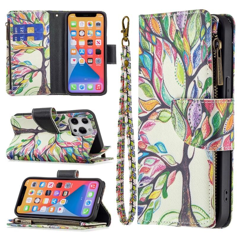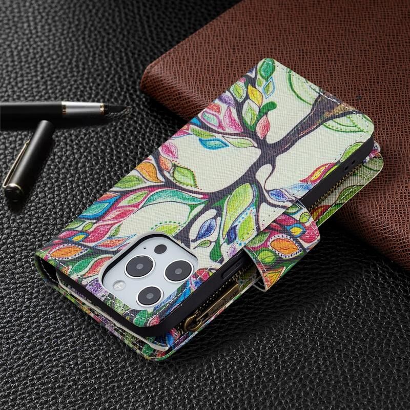 For iPhone 13 Pro Max Colored Drawing Pattern Zipper Horizontal Flip Leather Case with Holder & Card Slots & Wallet (Tree)