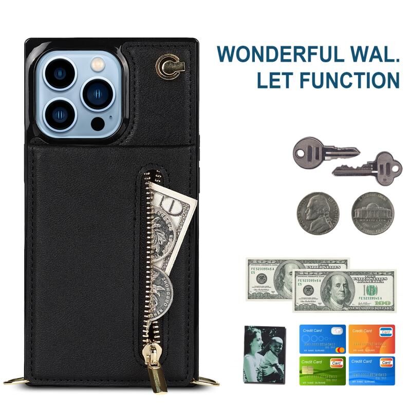 Θήκη κινητού για iPhone 13 Pro Max, διαγώνια, με φερμουάρ και τετράγωνο σχήμα, με θήκη (Μαύρο)