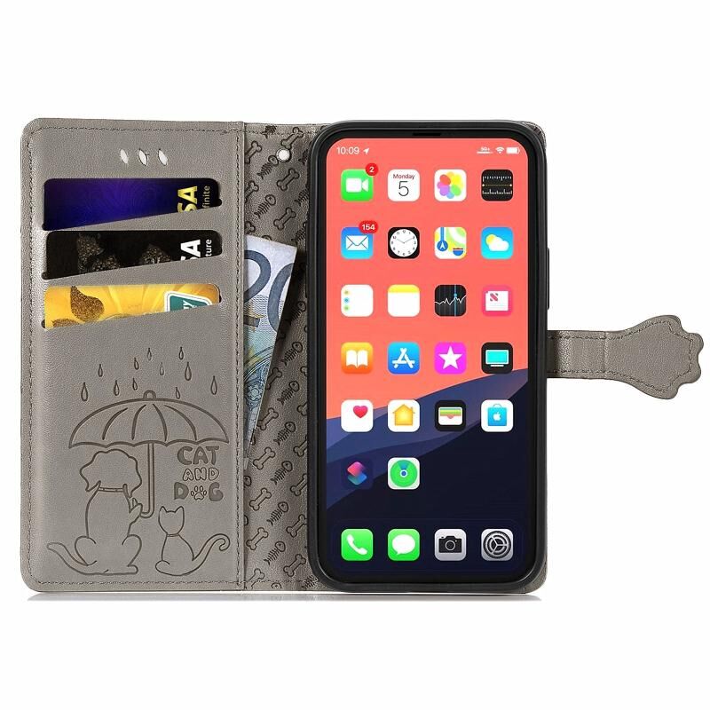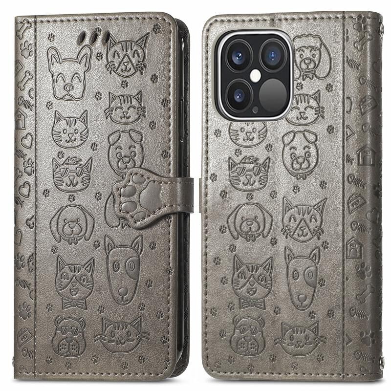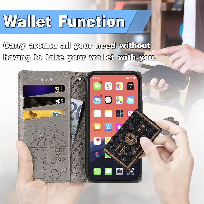Θήκη δέρματος οριζόντιας αναδίπλωσης για iPhone 13 Pro Max με χαριτωμένο σχέδιο γάτας και σκύλου σε ανάγλυφο, με βάση στήριξης, θήκες για κάρτες, πορτοφόλι και κορδόνι (Ροζ)