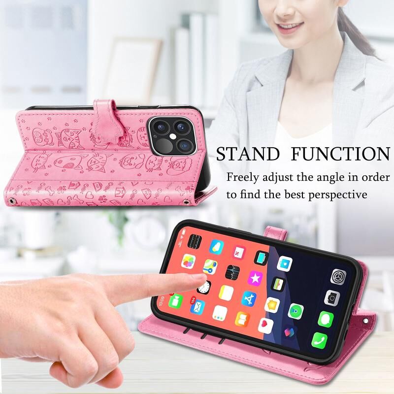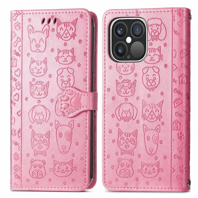 Θήκη δέρματος οριζόντιας αναδίπλωσης για iPhone 13 Pro Max με χαριτωμένο σχέδιο γάτας και σκύλου σε ανάγλυφο, με βάση στήριξης, θήκες για κάρτες, πορτοφόλι και κορδόνι (Ροζ)
