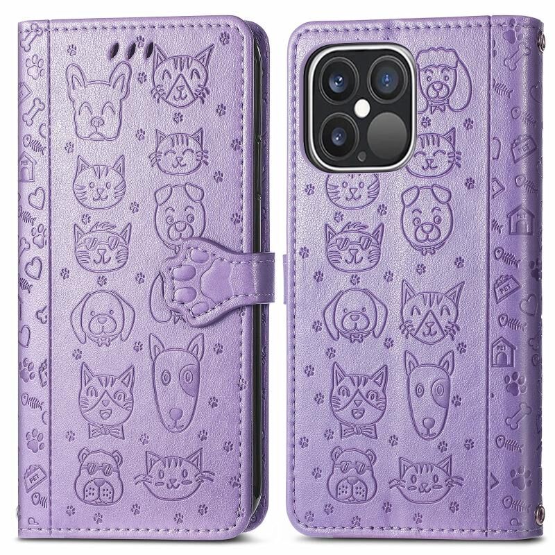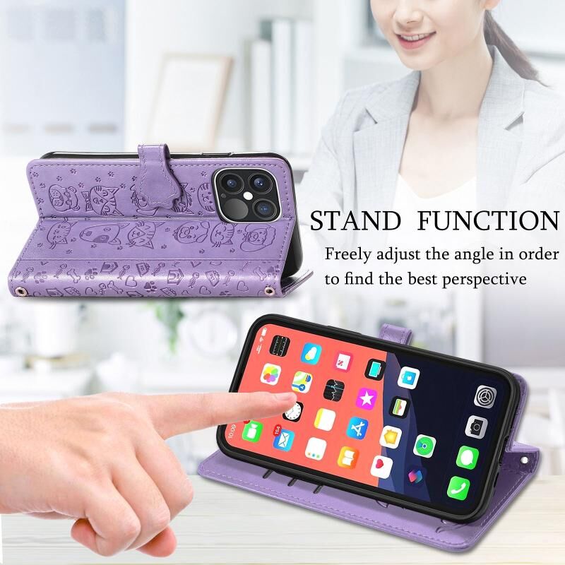 Θήκη δέρματος οριζόντιας αναδίπλωσης για iPhone 13 Pro Max με χαριτωμένο σχέδιο γάτας και σκύλου σε ανάγλυφο, με βάση στήριξης, θήκες για κάρτες, πορτοφόλι και κορδόνι (Ροζ)