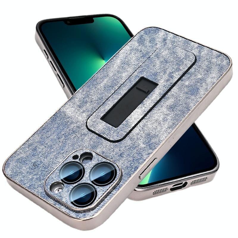 Θήκη τηλεφώνου με ψύξη για iPhone 13 Pro Max, μοτίβο τζιν, επιμεταλλωμένο, με αναδιπλούμενο στήριγμα (Μπλε)