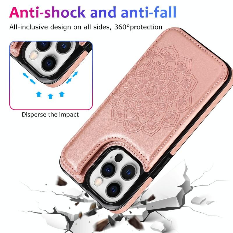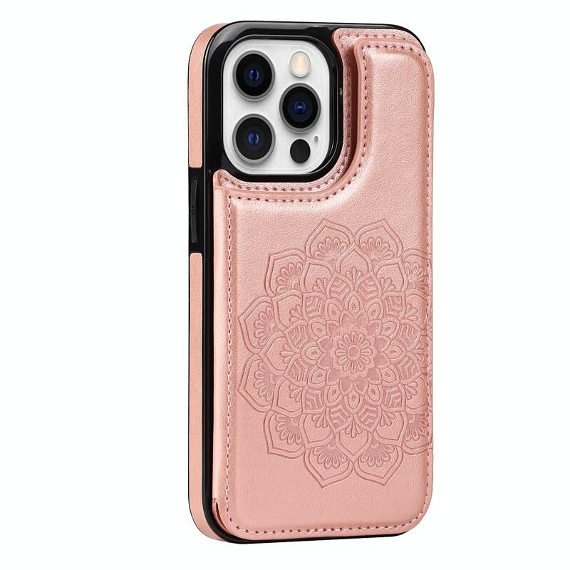 For iPhone 13 Pro Max Double Buckle Mandala Pattern PU+TPU Protective Case with Card Slots & Holder & Photo Frame (Rose Gold)