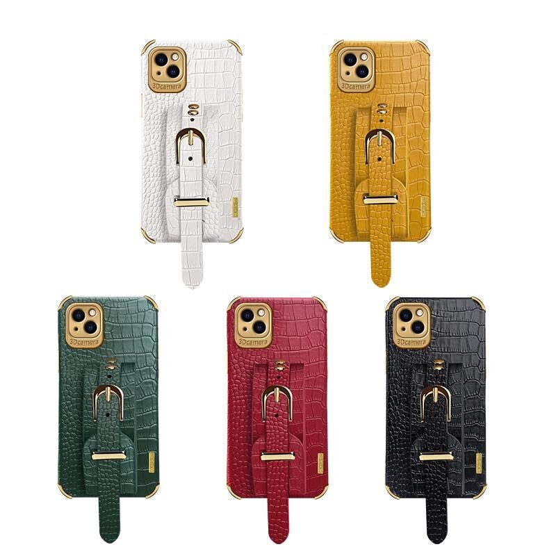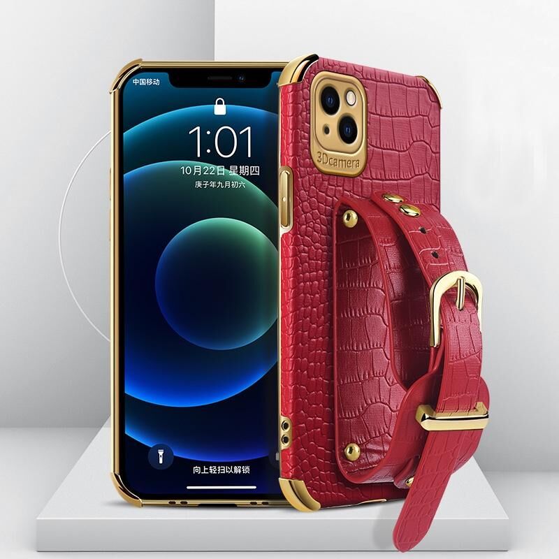 Θήκη για iPhone 13 Pro Max από θερμοπλαστικό πολυουρεθάνη (TPU) με ηλεκτρολυτική επίστρωση και σχέδιο δέρματος κροκόδειλου με λουρί καρπού (Μαύρο)