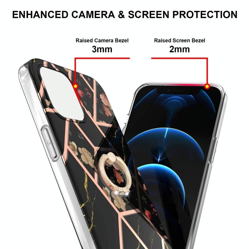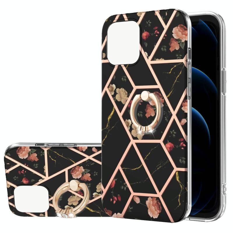For iPhone 13 Pro Max Electroplating Splicing Marble Flower Pattern TPU Shockproof Case with Rhinestone Ring Holder (Black Flower)