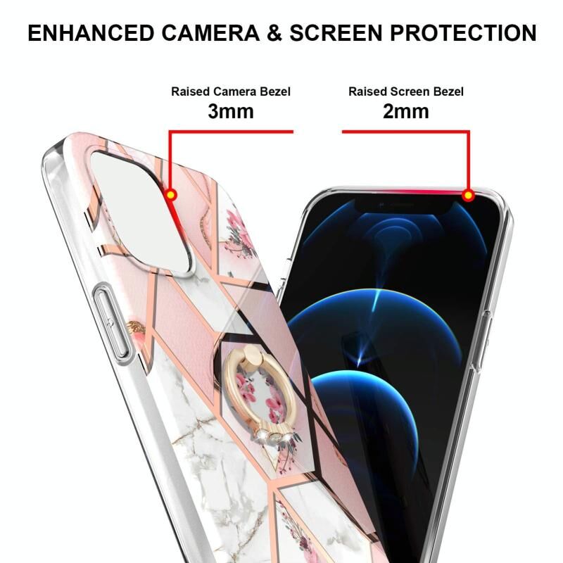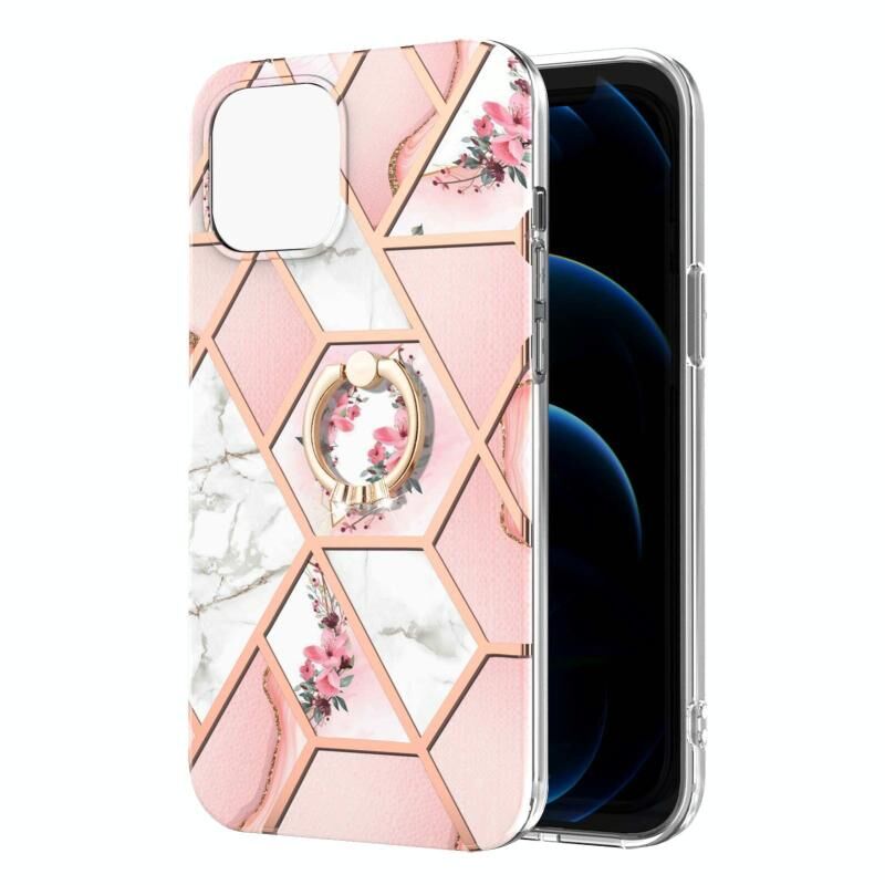 For iPhone 13 Pro Max Electroplating Splicing Marble Flower Pattern TPU Shockproof Case with Rhinestone Ring Holder (Pink Flower)