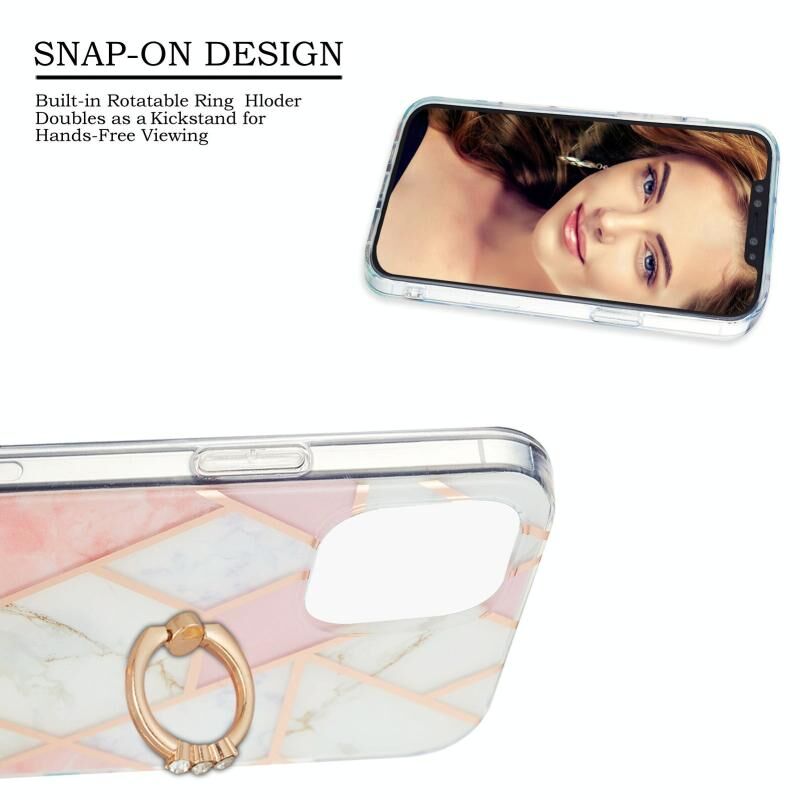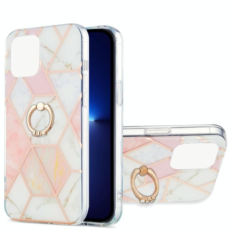 For iPhone 13 Pro Max Electroplating Splicing Marble Pattern Dual-side IMD TPU Shockproof Case with Ring Holder (Pink White)