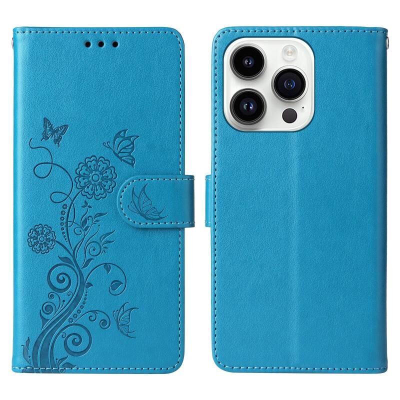 For iPhone 13 Pro Max Embossed Butterfly Flowers Leather Phone Case(Blue)