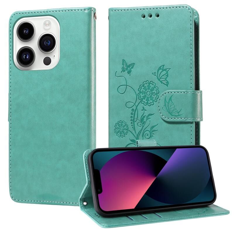 For iPhone 13 Pro Max Embossed Butterfly Flowers Leather Phone Case(Green)