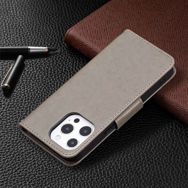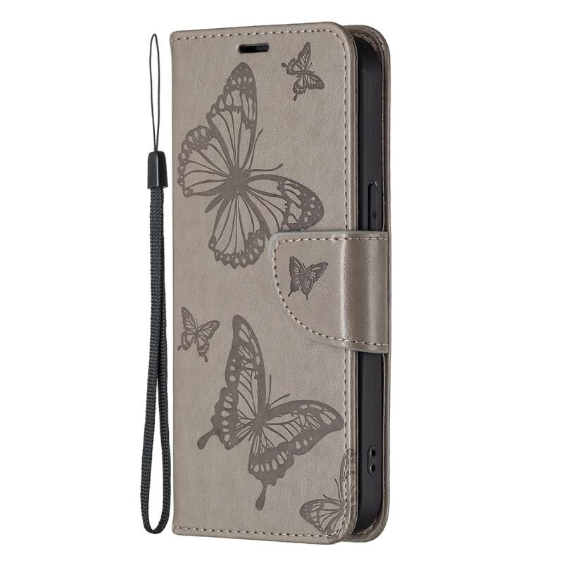 For iPhone 13 Pro Max Embossing Two Butterflies Pattern Horizontal Flip PU Leather Case with Holder & Card Slot & Wallet & Lanyard (Grey)