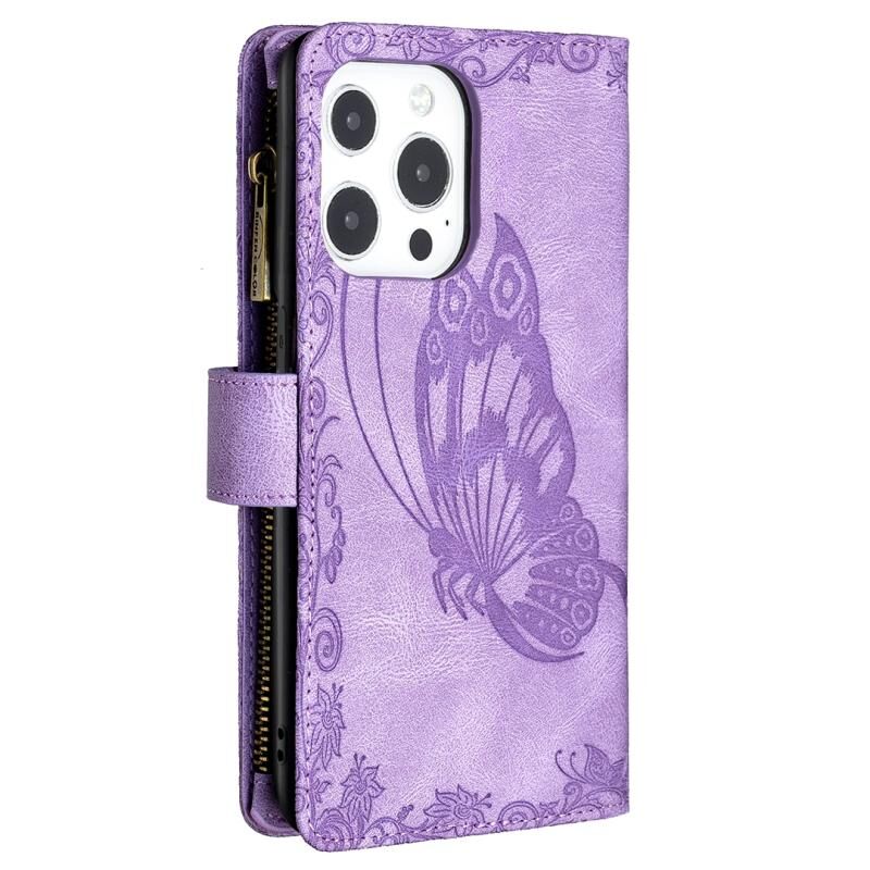 For iPhone 13 Pro Max Flying Butterfly Embossing Pattern Zipper Horizontal Flip Leather Case with Holder & Card Slots & Wallet (Purple)