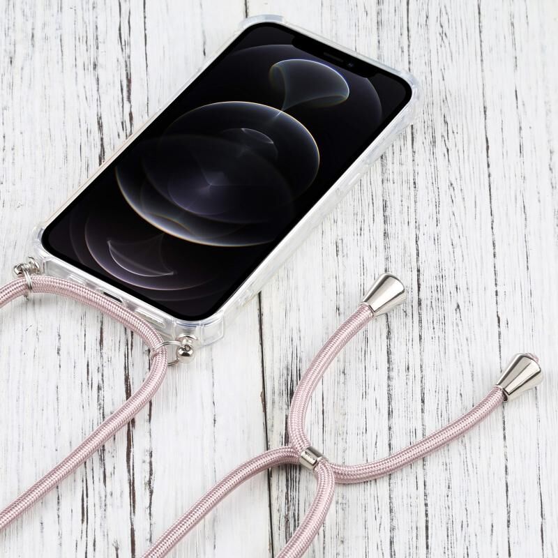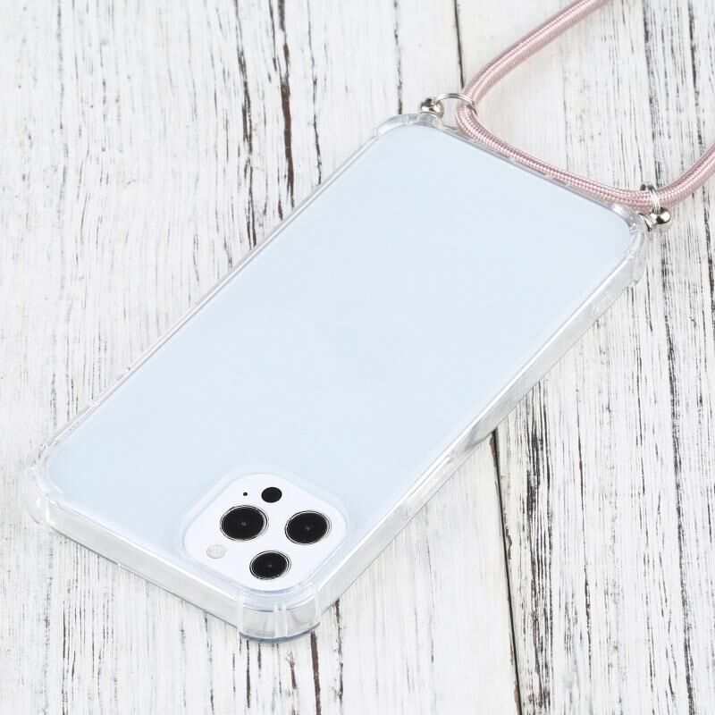 For iPhone 13 Pro Max Four-corner Shockproof Transparent TPU Protective Case with Lanyard (Light Pink)