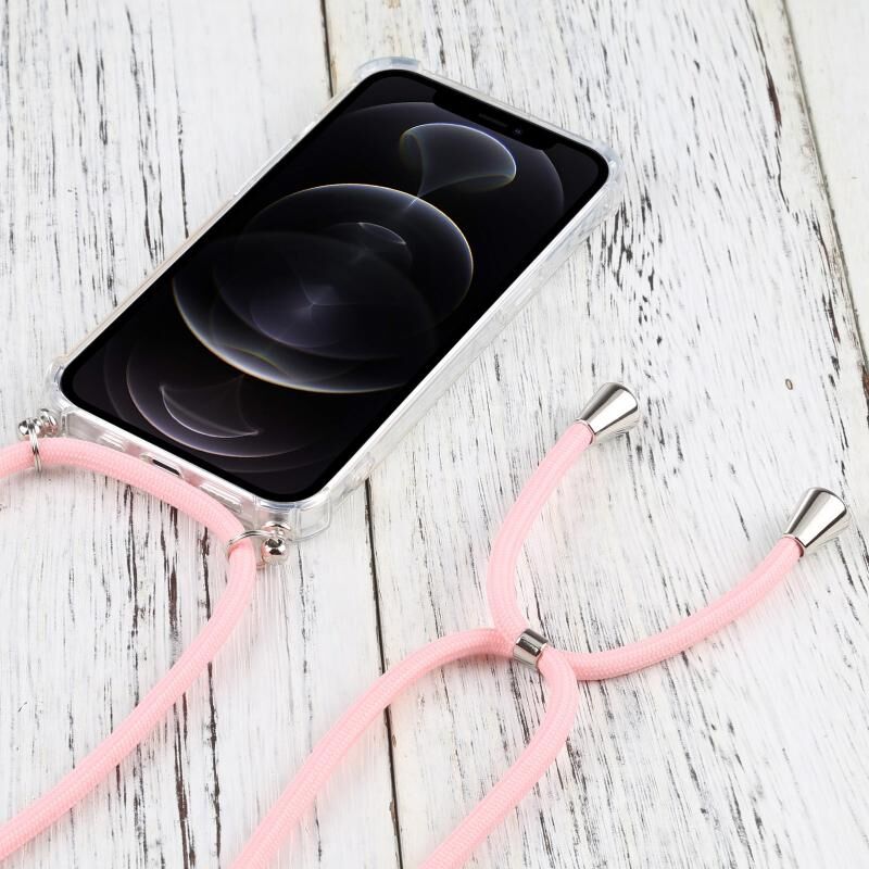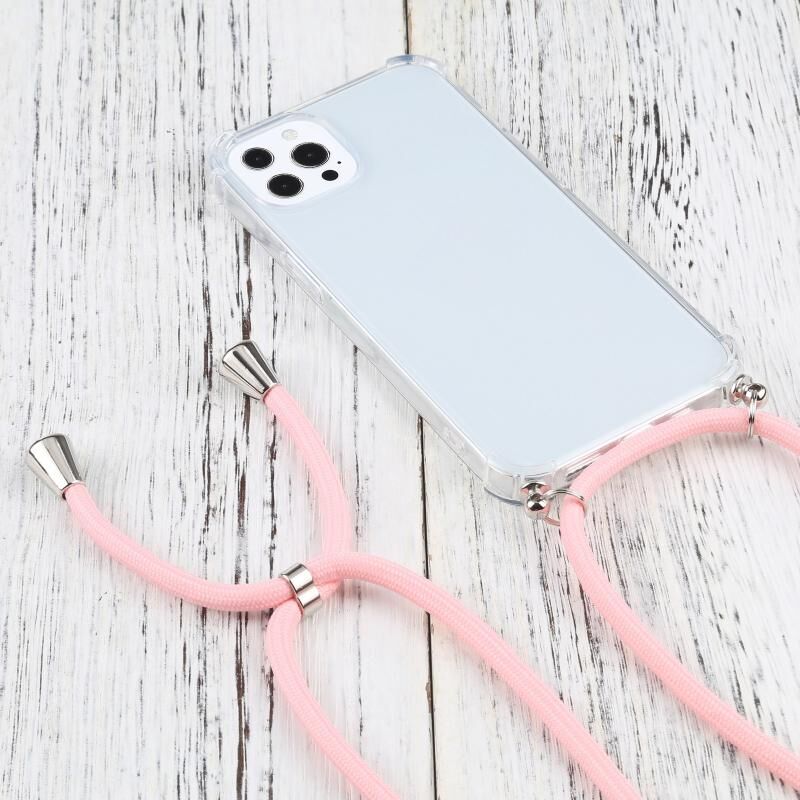 For iPhone 13 Pro Max Four-corner Shockproof Transparent TPU Protective Case with Lanyard (Pink)