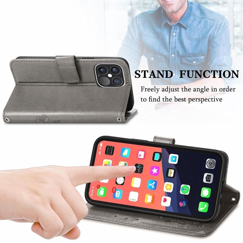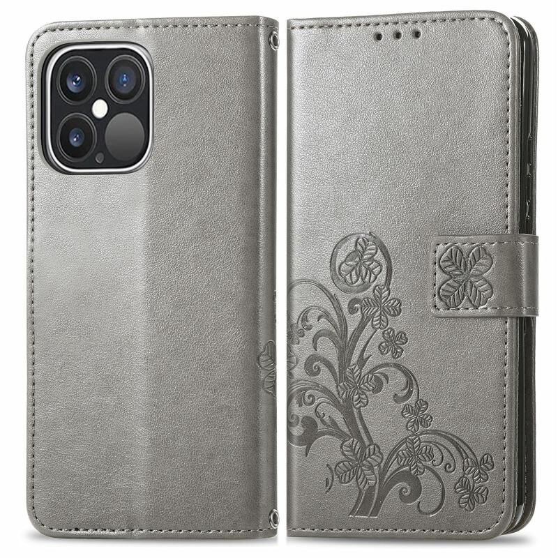 Θήκη δερμάτινη για iPhone 13 Pro Max με σχέδιο τριφυλλιού, ανάγλυφη αγκράφα, προστασία κινητού, λουρί, θήκη για κάρτες, πορτοφόλι και λειτουργία βάσης (Χρυσό ροζ)