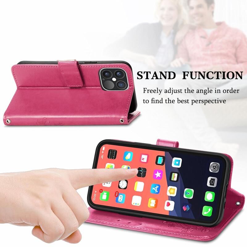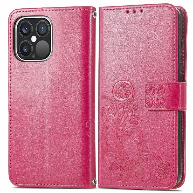 Θήκη δερμάτινη για iPhone 13 Pro Max με σχέδιο τριφυλλιού, ανάγλυφη αγκράφα, προστασία κινητού, λουρί, θήκη για κάρτες, πορτοφόλι και λειτουργία βάσης (Ματζέντα)