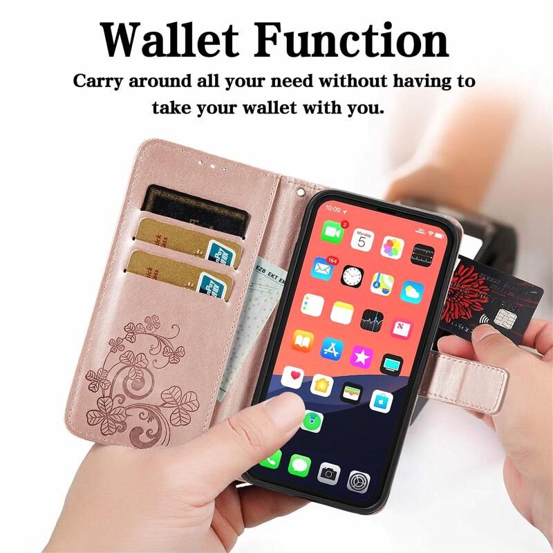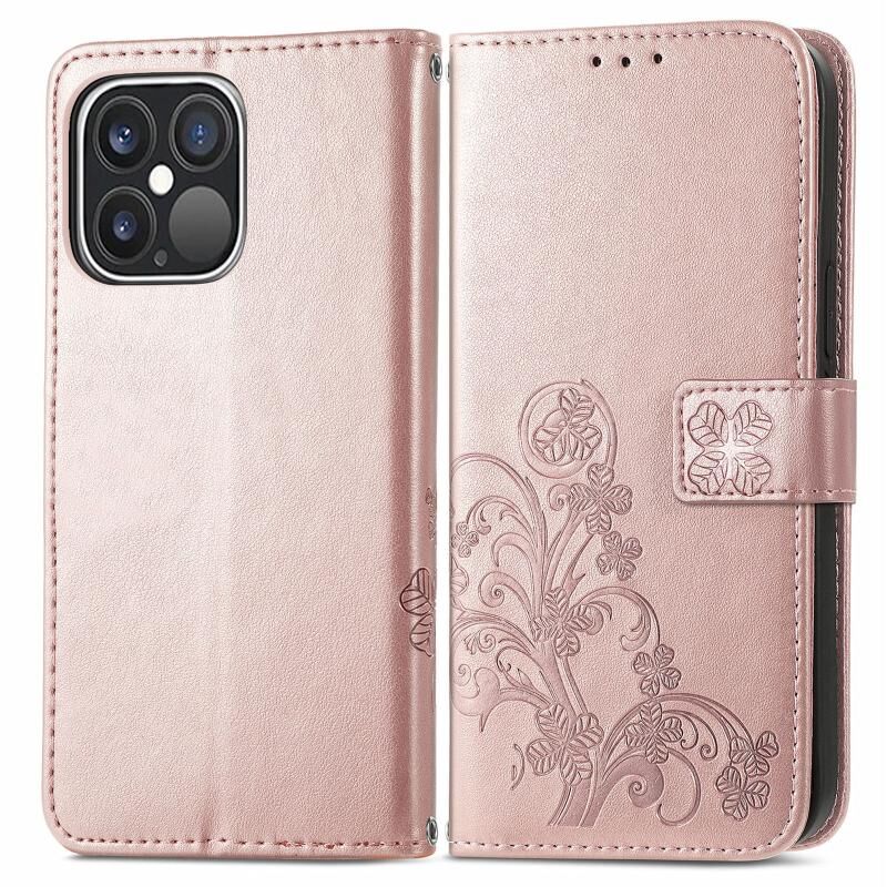 Θήκη δερμάτινη για iPhone 13 Pro Max με σχέδιο τριφυλλιού, ανάγλυφη αγκράφα, προστασία κινητού, λουρί, θήκη για κάρτες, πορτοφόλι και λειτουργία βάσης (Χρυσό ροζ)