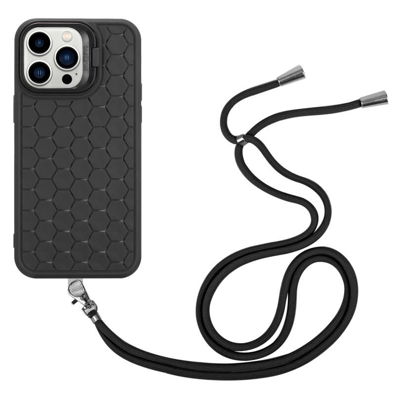 For iPhone 13 Pro Max Honeycomb Radiating Holder TPU Phone Case with Lanyard(Black)