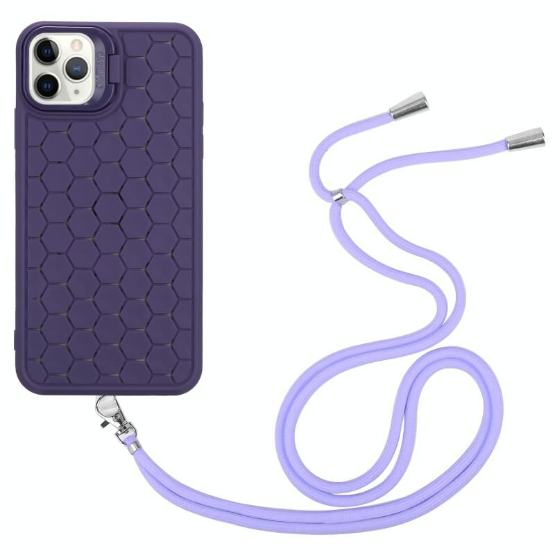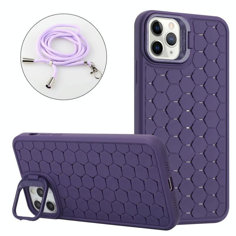 For iPhone 13 Pro Max Honeycomb Radiating Lens Holder Magsafe Phone Case with Lanyard(Purple)