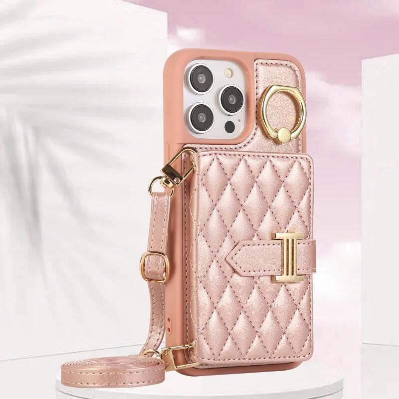 For iPhone 13 Pro Max Horizontal Card Bag Ring Holder Phone Case with Dual Lanyard(Rose Gold)