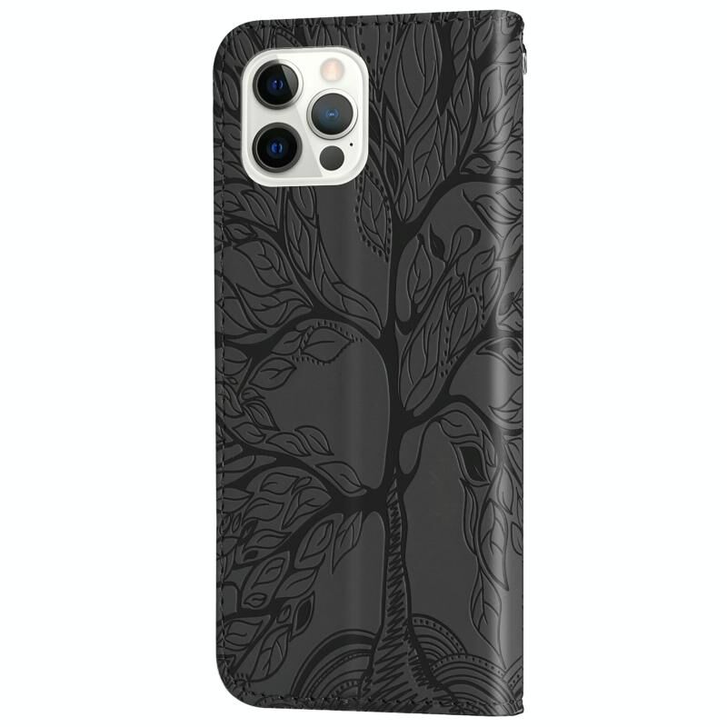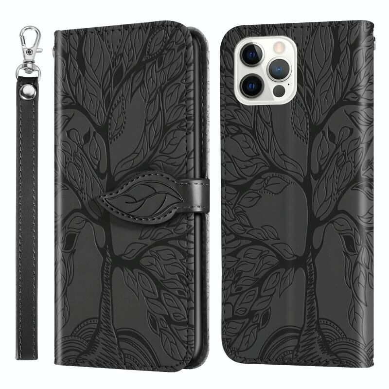 For iPhone 13 Pro Max Life of Tree Embossing Pattern Horizontal Flip Leather Case with Holder & Card Slot & Wallet & Photo Frame & Lanyard (Black)