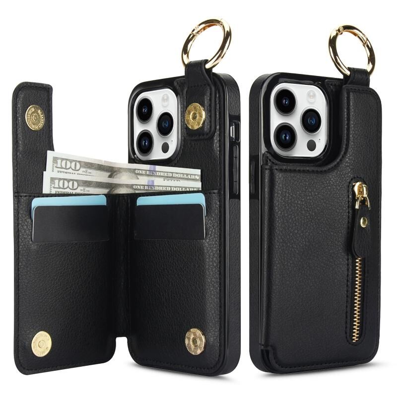 Για iPhone 13 Pro Max Litchi υφή φερμουάρ διπλή πόρπη κάρτα τσάντα υπόθεση τηλεφώνου (μαύρο)