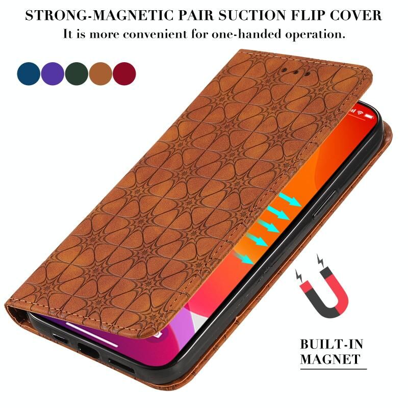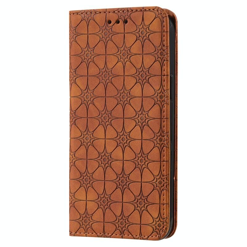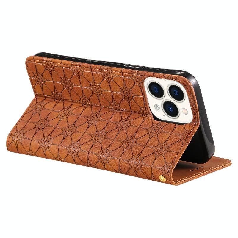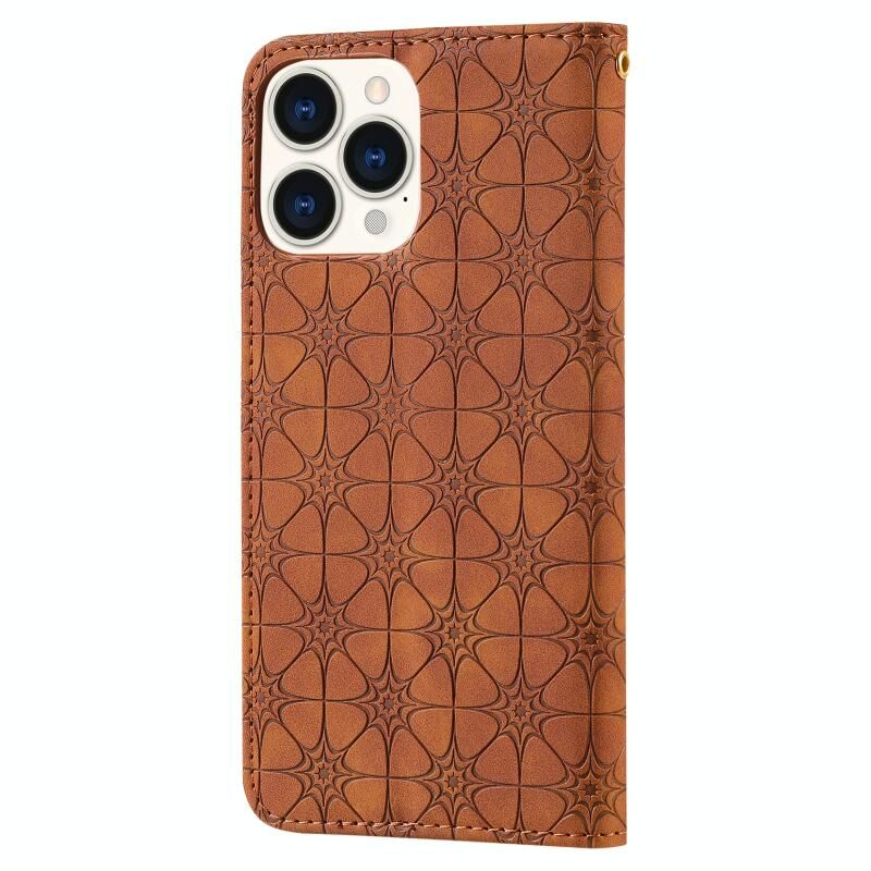 For iPhone 13 Pro Max Lucky Flowers Embossing Pattern Magnetic Horizontal Flip Leather Case with Holder & Card Slots (Yellow Brown)