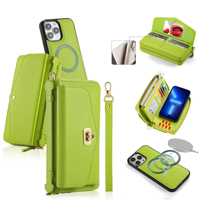 Θήκη τηλεφώνου για iPhone 13 Pro Max MagSafe, πολυλειτουργική, με φερμουάρ και πορτοφόλι από δέρμα Lychee (Πράσινο)