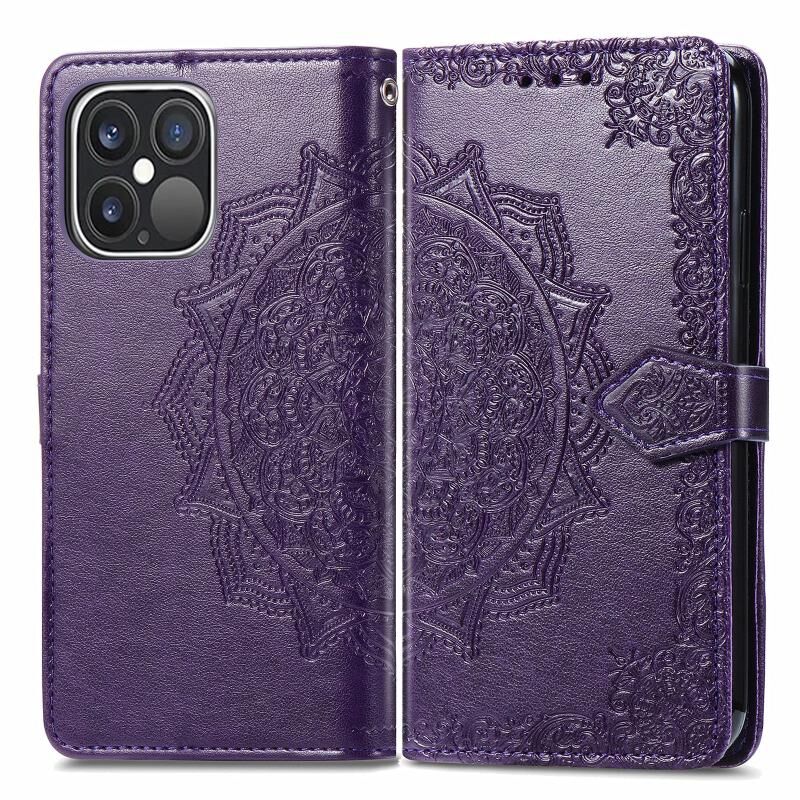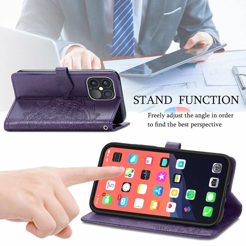 Θήκη για iPhone 13 Pro Max, δερμάτινη οριζόντια με αναδιπλούμενο καπάκι, με σχέδιο Mandala, θήκη για κάρτες (3 θέσεις), πορτοφόλι και λουρί (Μαύρο)