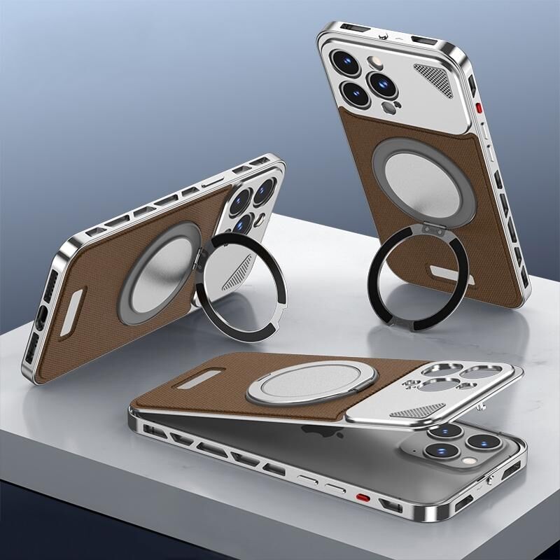 For iPhone 13 Pro Max Metal Snap Buckle 360 Degree Rotating MagSafe Magnetic Holder Phone Case(Dark Brown Silver)