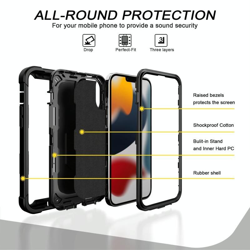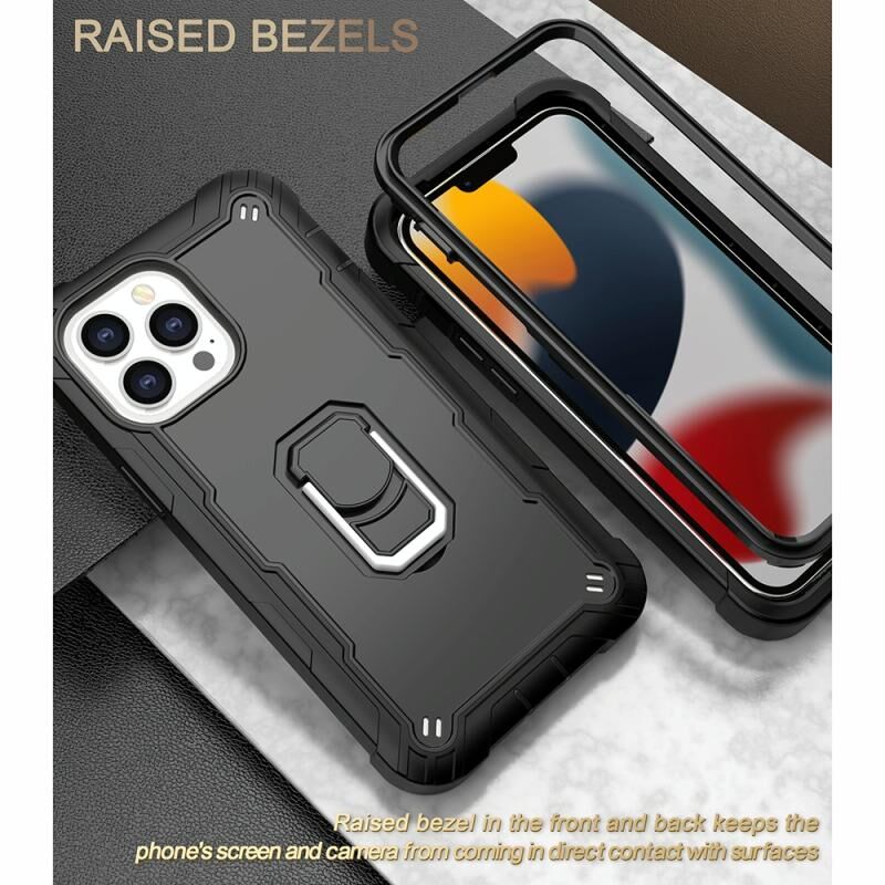 For iPhone 13 Pro Max PC + Rubber 3-layers Shockproof Protective Case with Rotating Holder (Black)