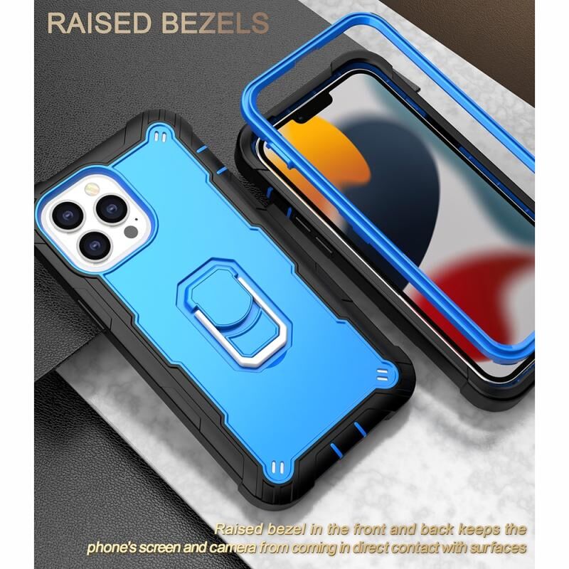 For iPhone 13 Pro Max PC + Rubber 3-layers Shockproof Protective Case with Rotating Holder (Black + Blue)