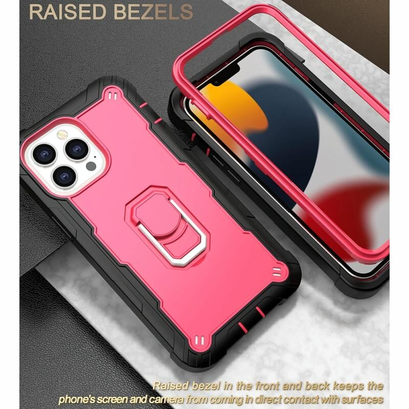 For iPhone 13 Pro Max PC + Rubber 3-layers Shockproof Protective Case with Rotating Holder (Black + Rose Red)