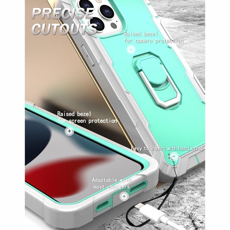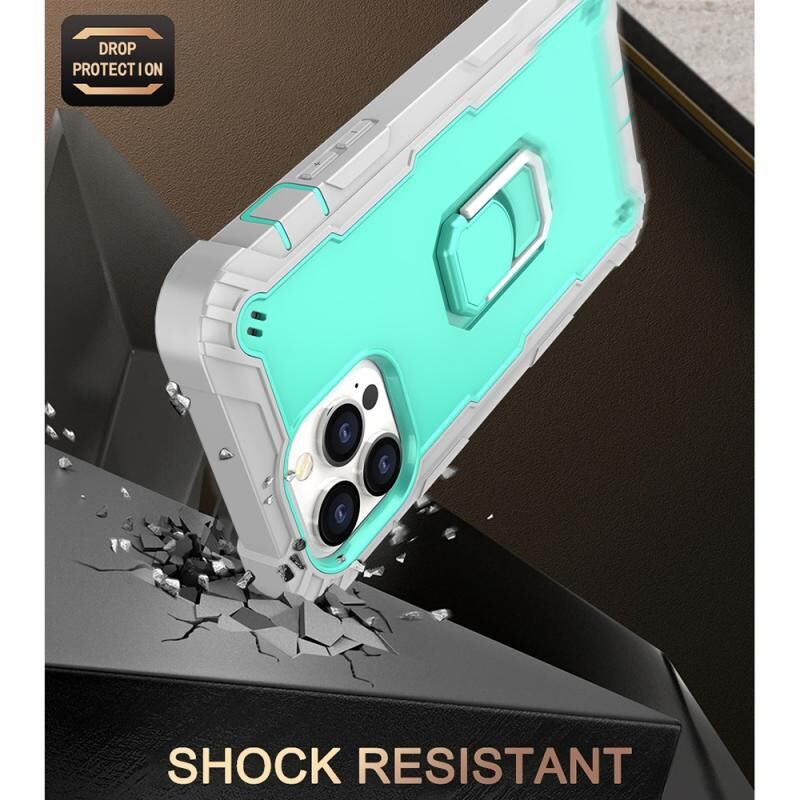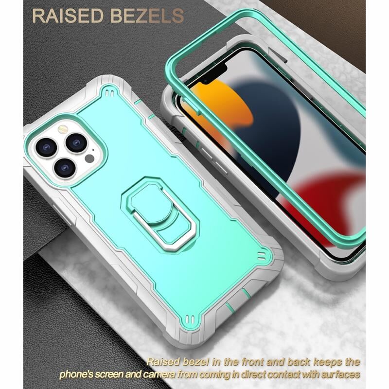 For iPhone 13 Pro Max PC + Rubber 3-layers Shockproof Protective Case with Rotating Holder (Grey White + Mint Green)