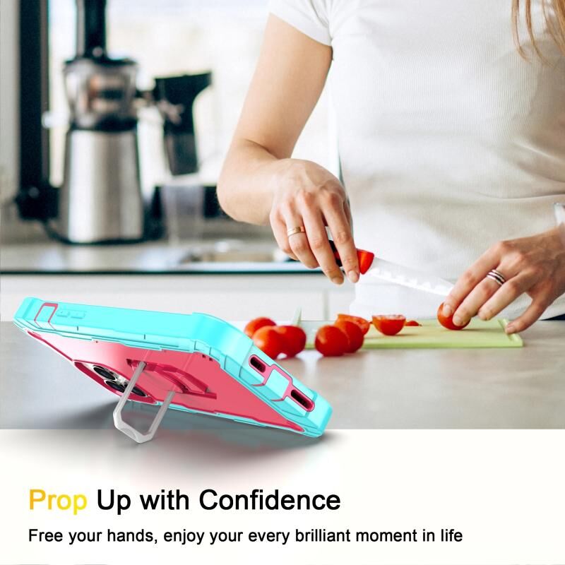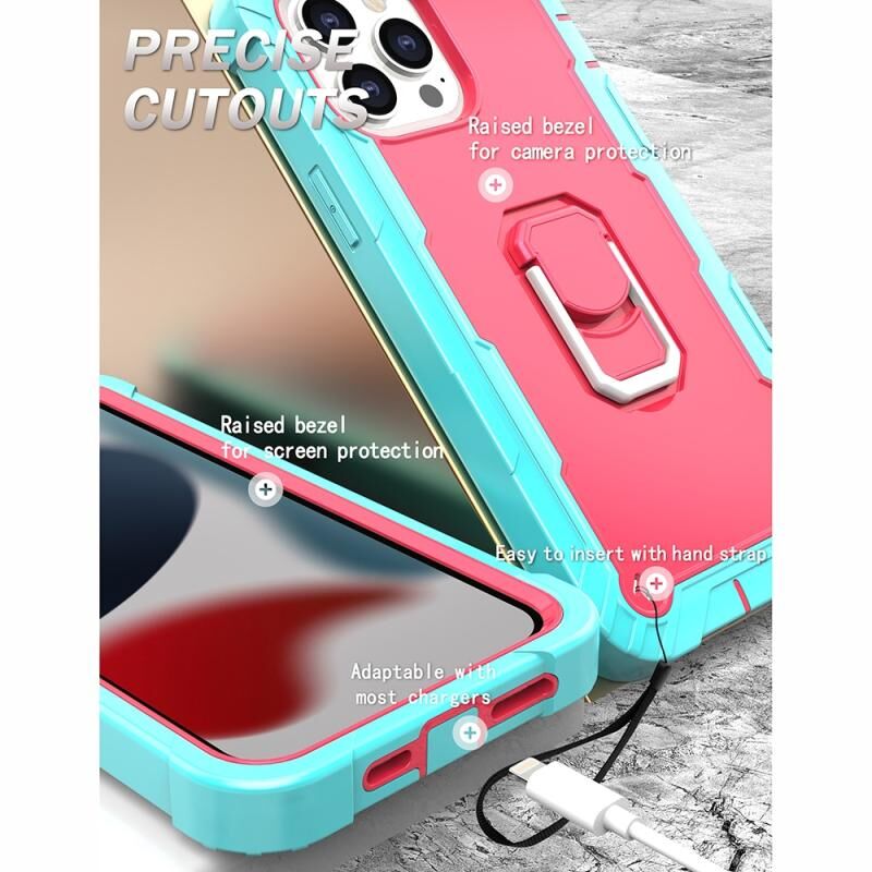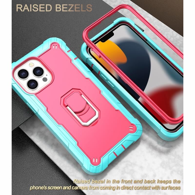 For iPhone 13 Pro Max PC + Rubber 3-layers Shockproof Protective Case with Rotating Holder (Mint Green + Rose Red)