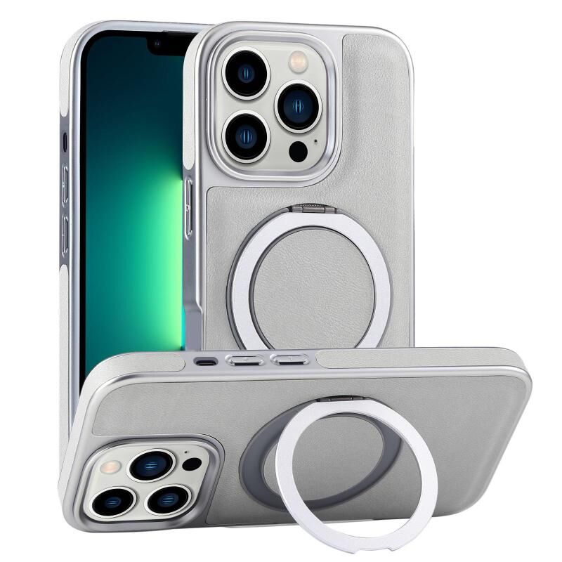 For iPhone 13 Pro Max Plated Leather Grain Rotation MagSafe Holder Phone Case(Grayish Green)