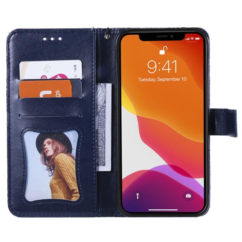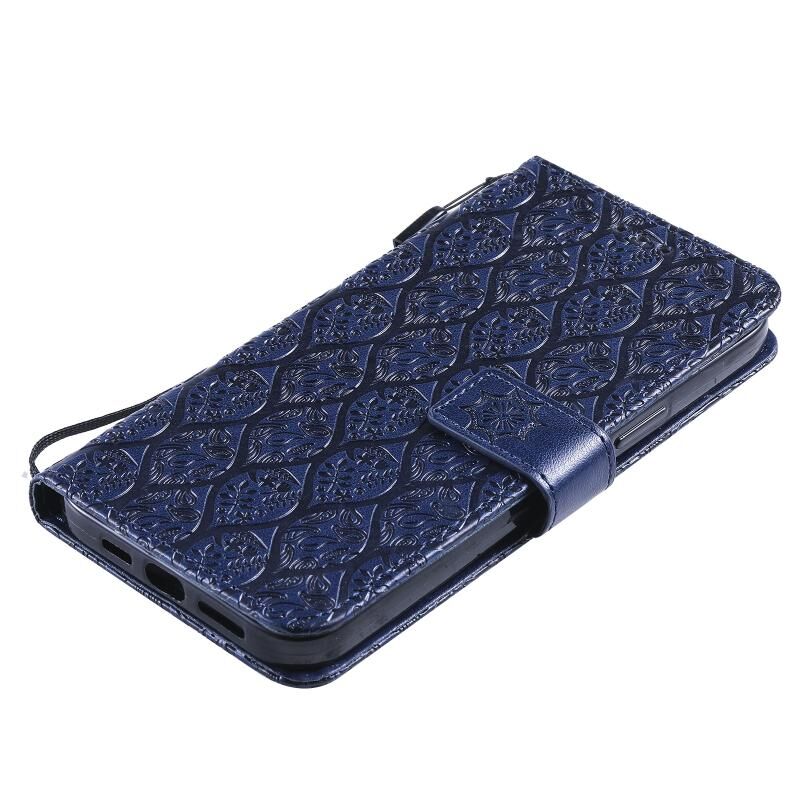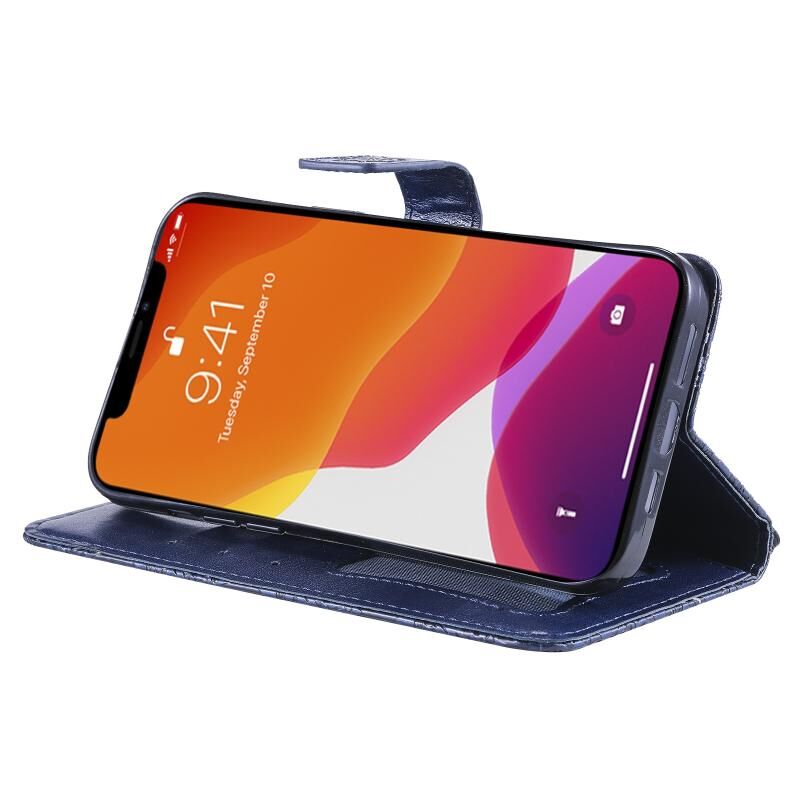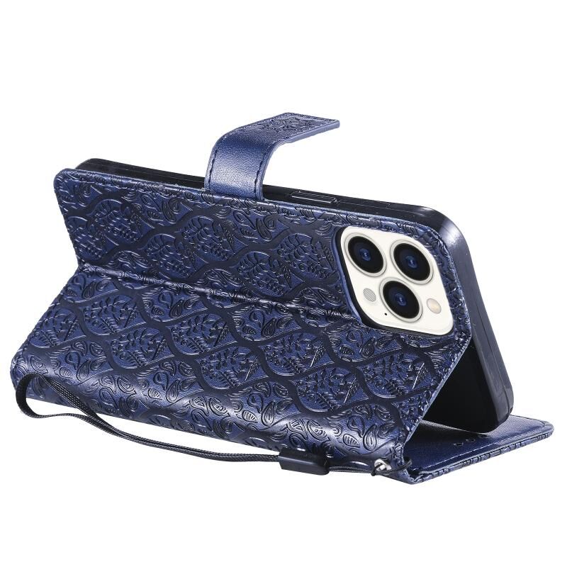 For iPhone 13 Pro Max Pressed Printing Rattan Flower Pattern Horizontal Flip PU Leather Case with Holder & Card Slots & Wallet & Photo Frame (Dark Blue)