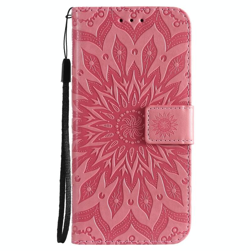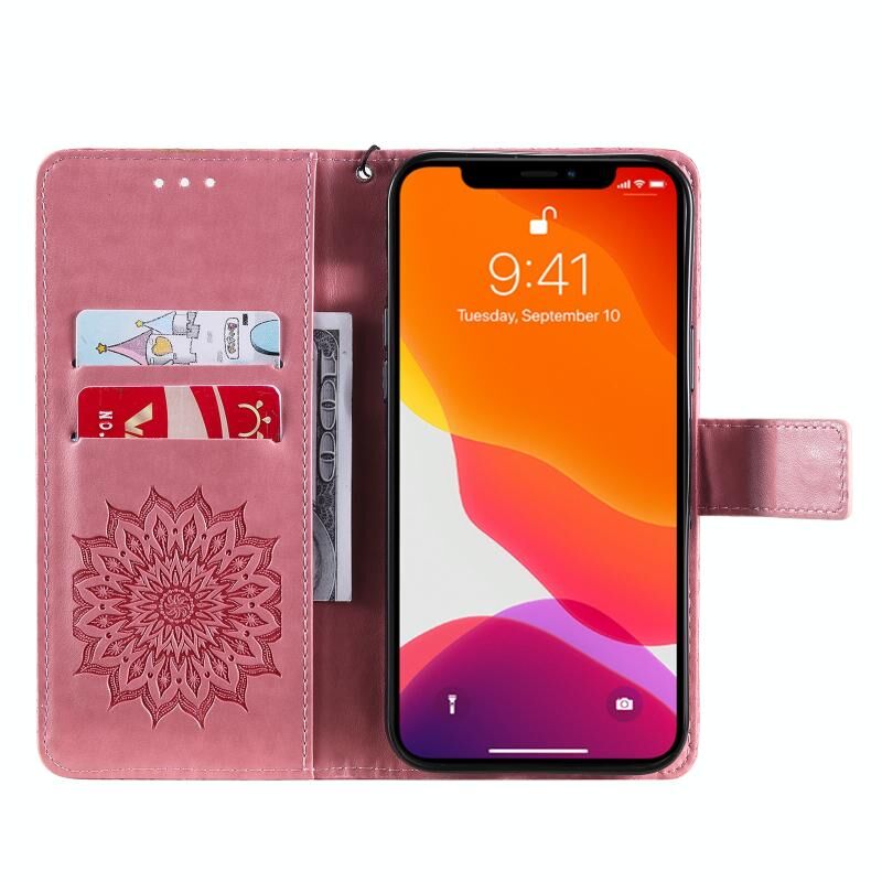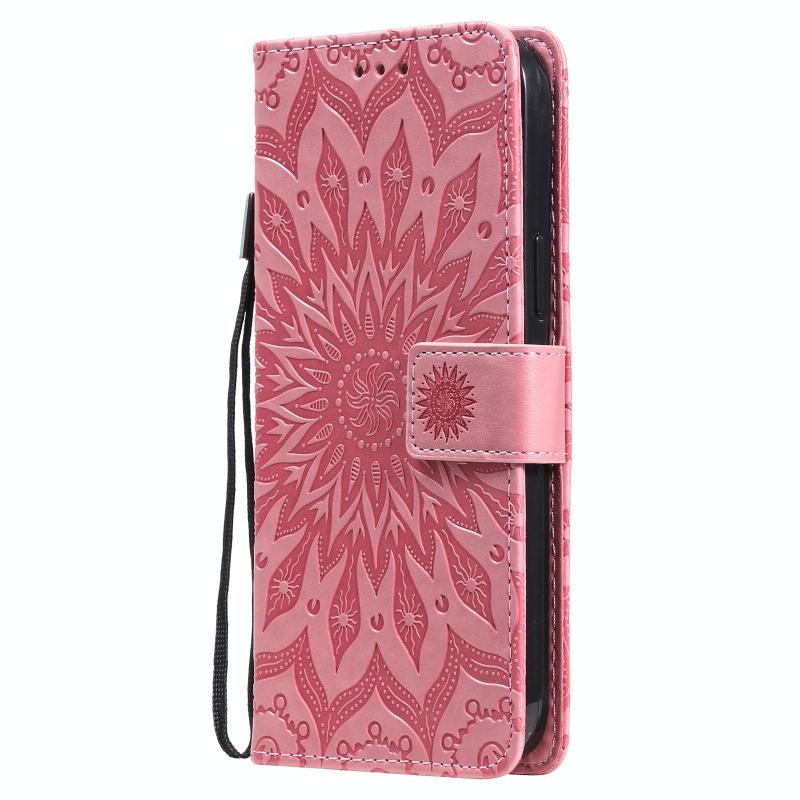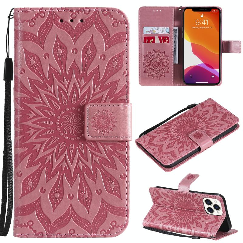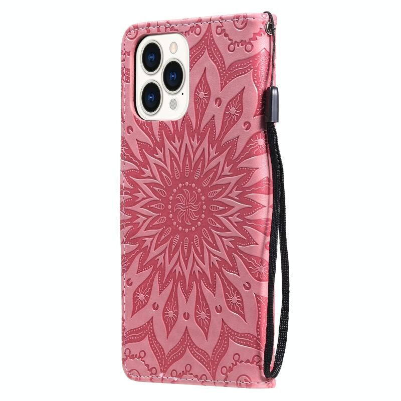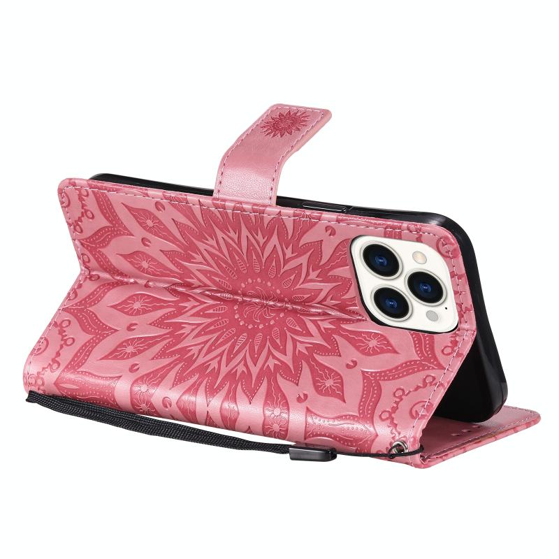 Θήκη για iPhone 13 Pro Max με εκτυπωμένο σχέδιο ηλιοτρόπιου, οριζόντια, από δερματίνη PU, με θήκη & υποδοχές για κάρτες & πορτοφόλι & κορδόνι (ρόζ)