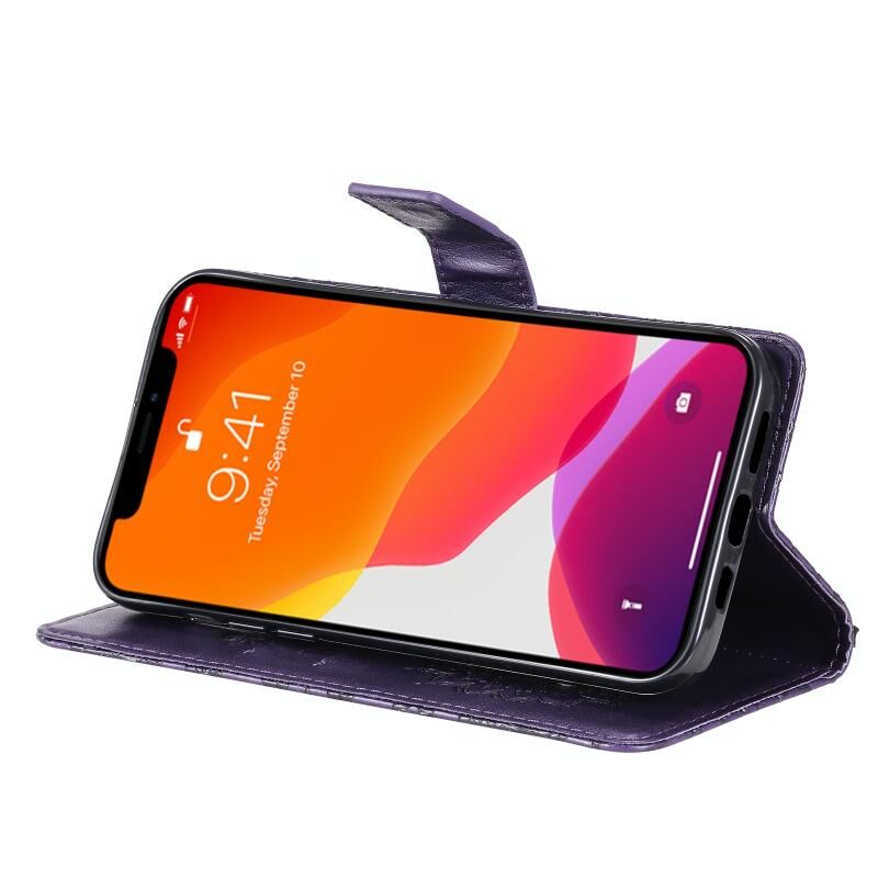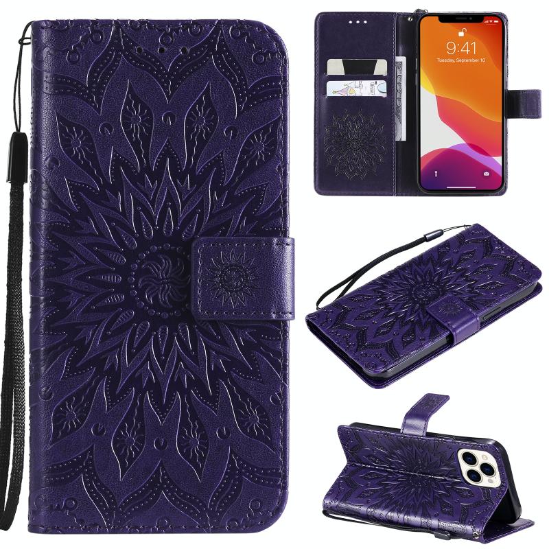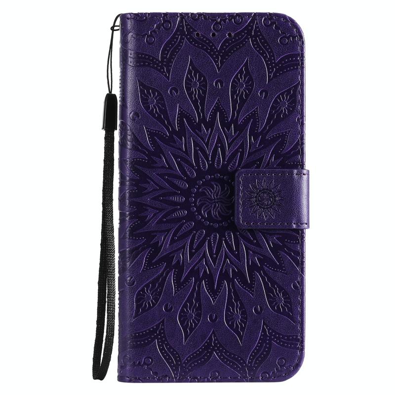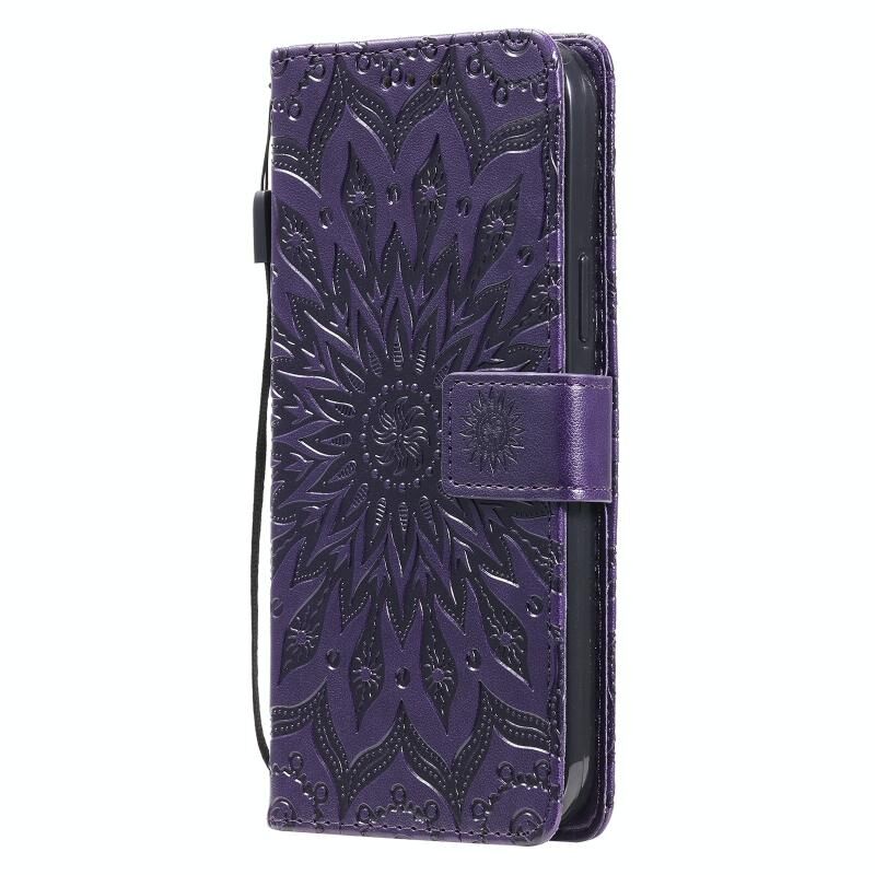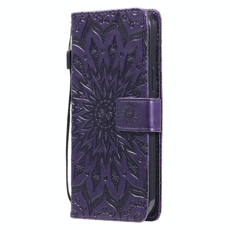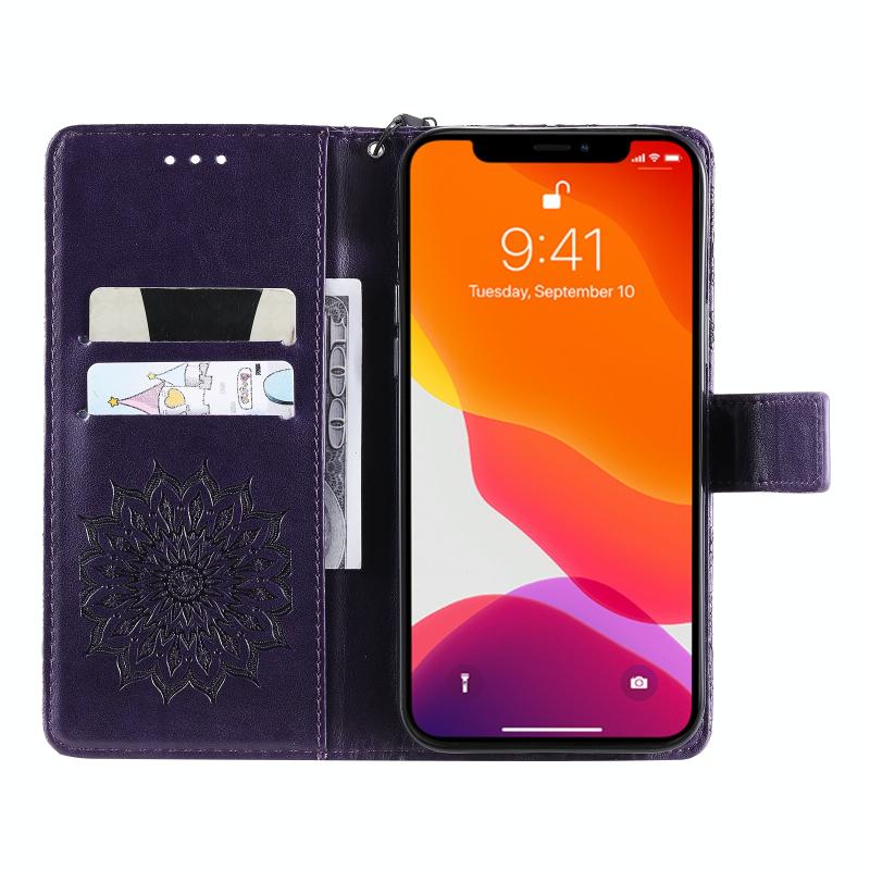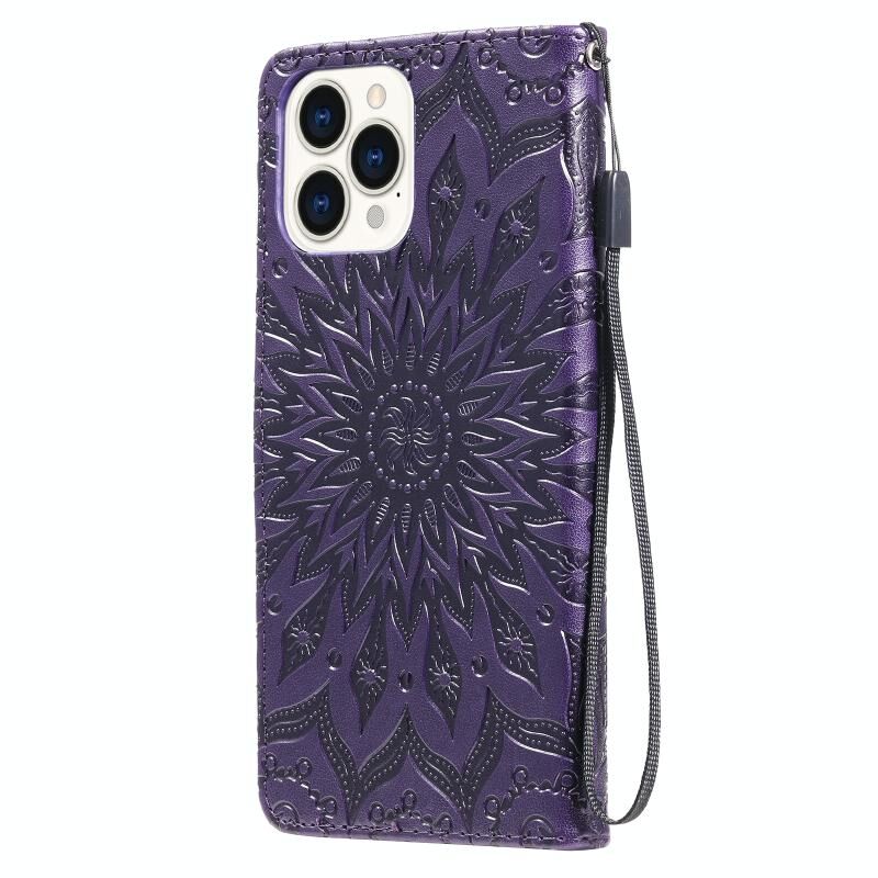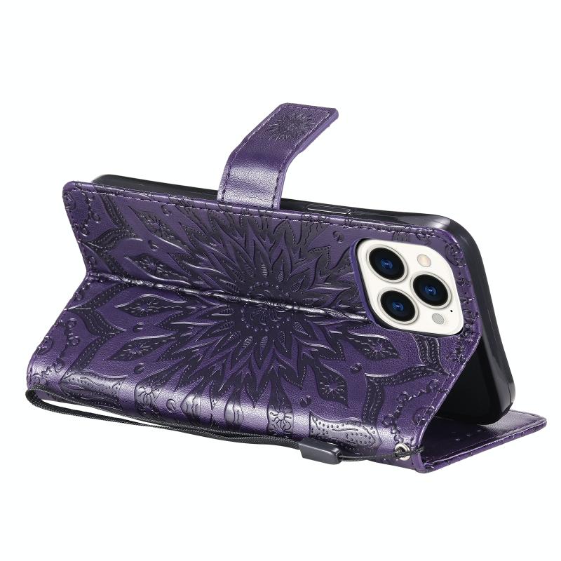Θήκη για iPhone 13 Pro Max με εκτυπωμένο σχέδιο ηλιοτρόπιου, οριζόντια, από δερματίνη PU, με θήκη & υποδοχές για κάρτες & πορτοφόλι & κορδόνι (Μωβ)