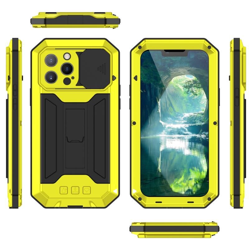 For iPhone 13 Pro Max R-JUST Sliding Camera Shockproof Life Waterproof Dust-proof Metal + Silicone Protective Case with Holder (Yellow) (R-JUST)