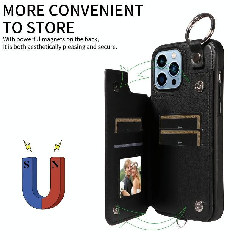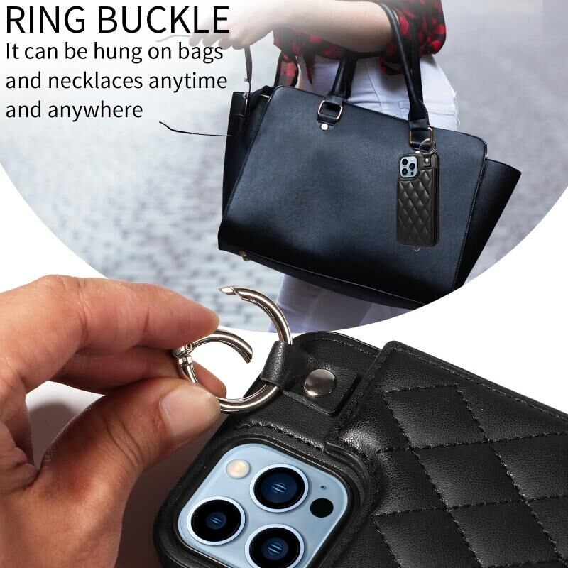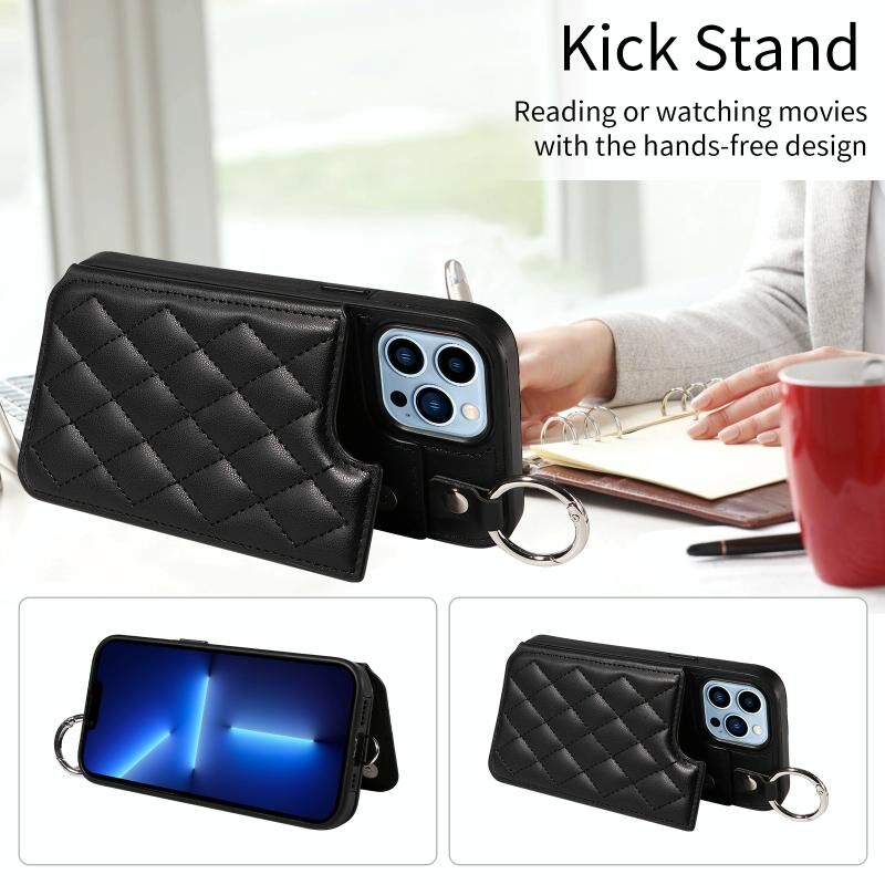 For iPhone 13 Pro Max Rhombic Texture Card Bag Phone Case with Short Lanyard(Black)